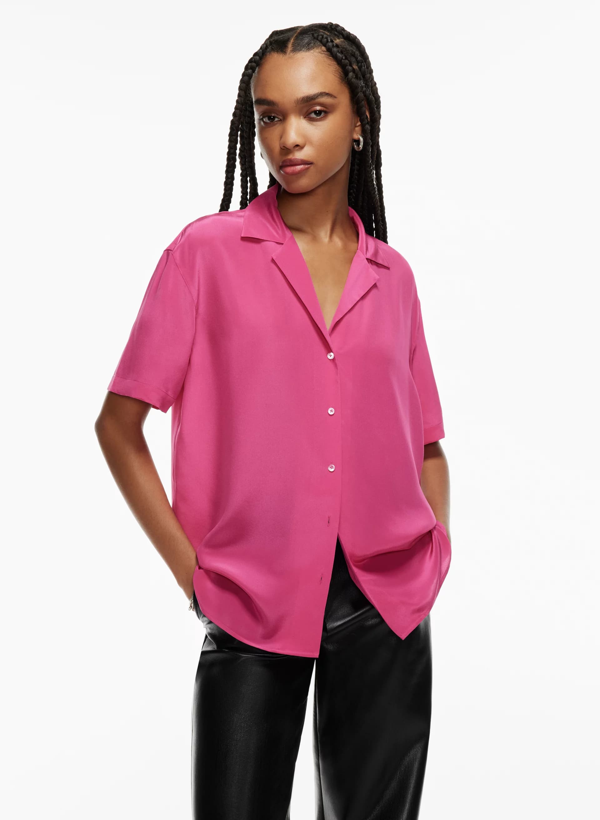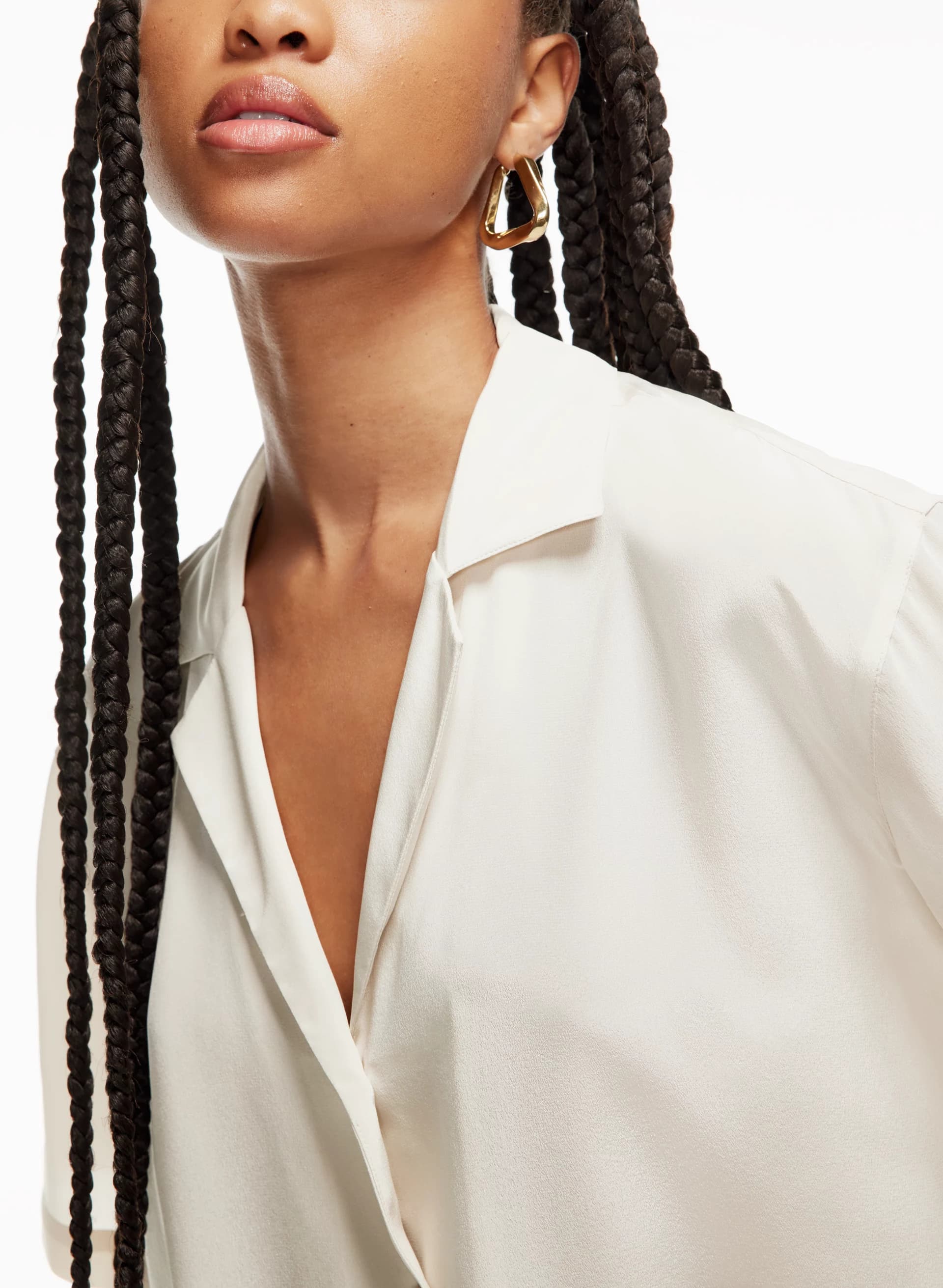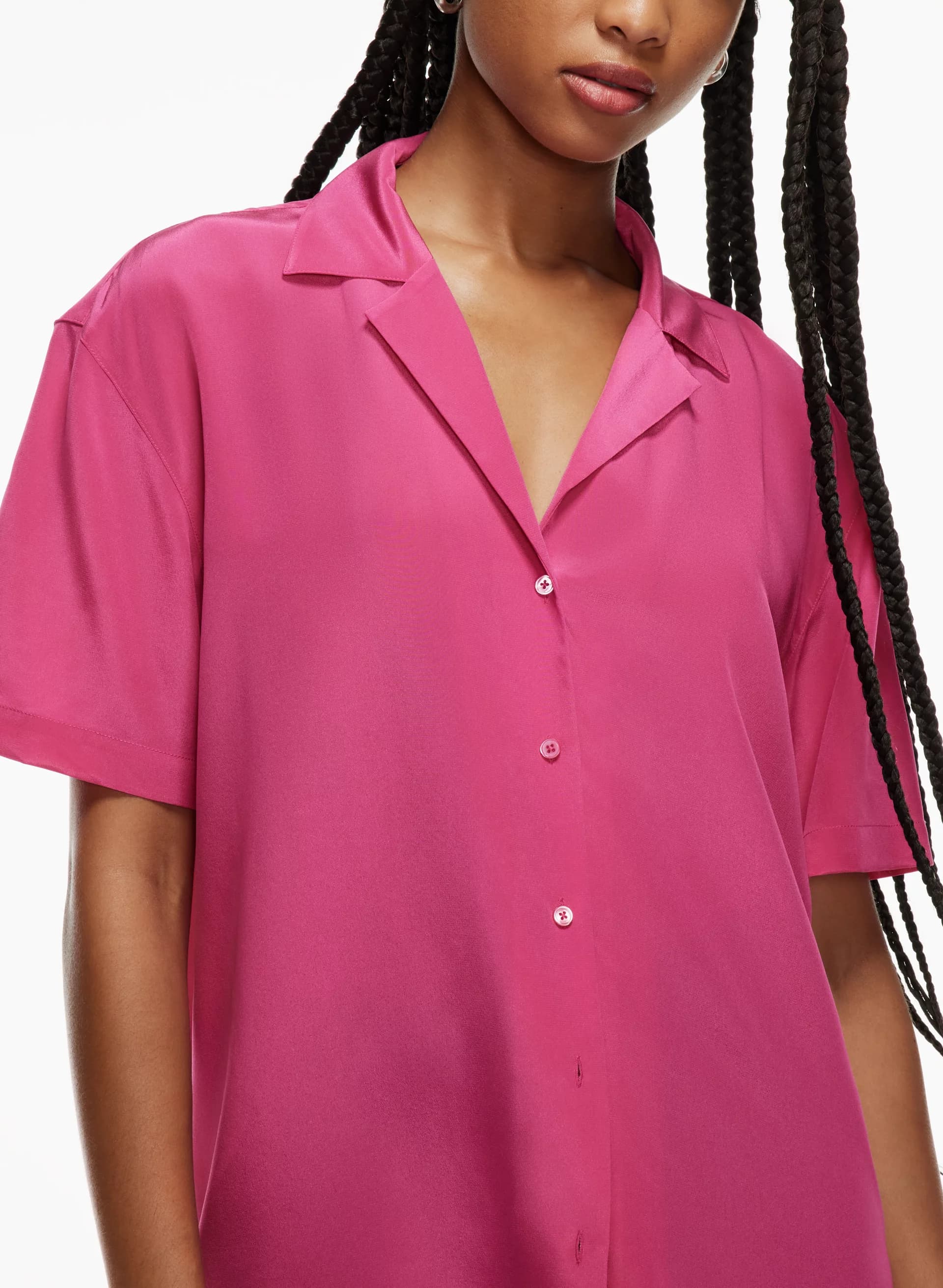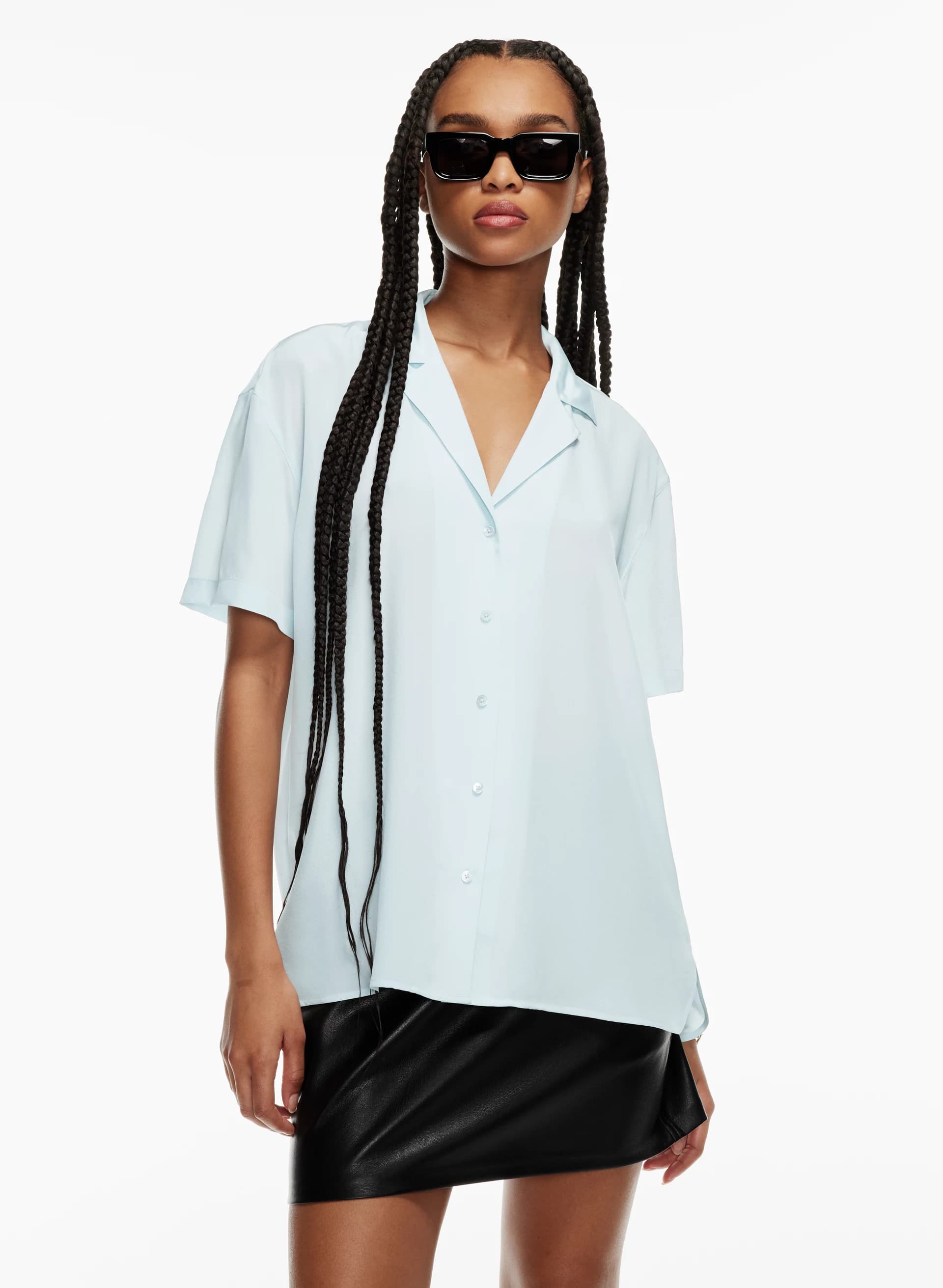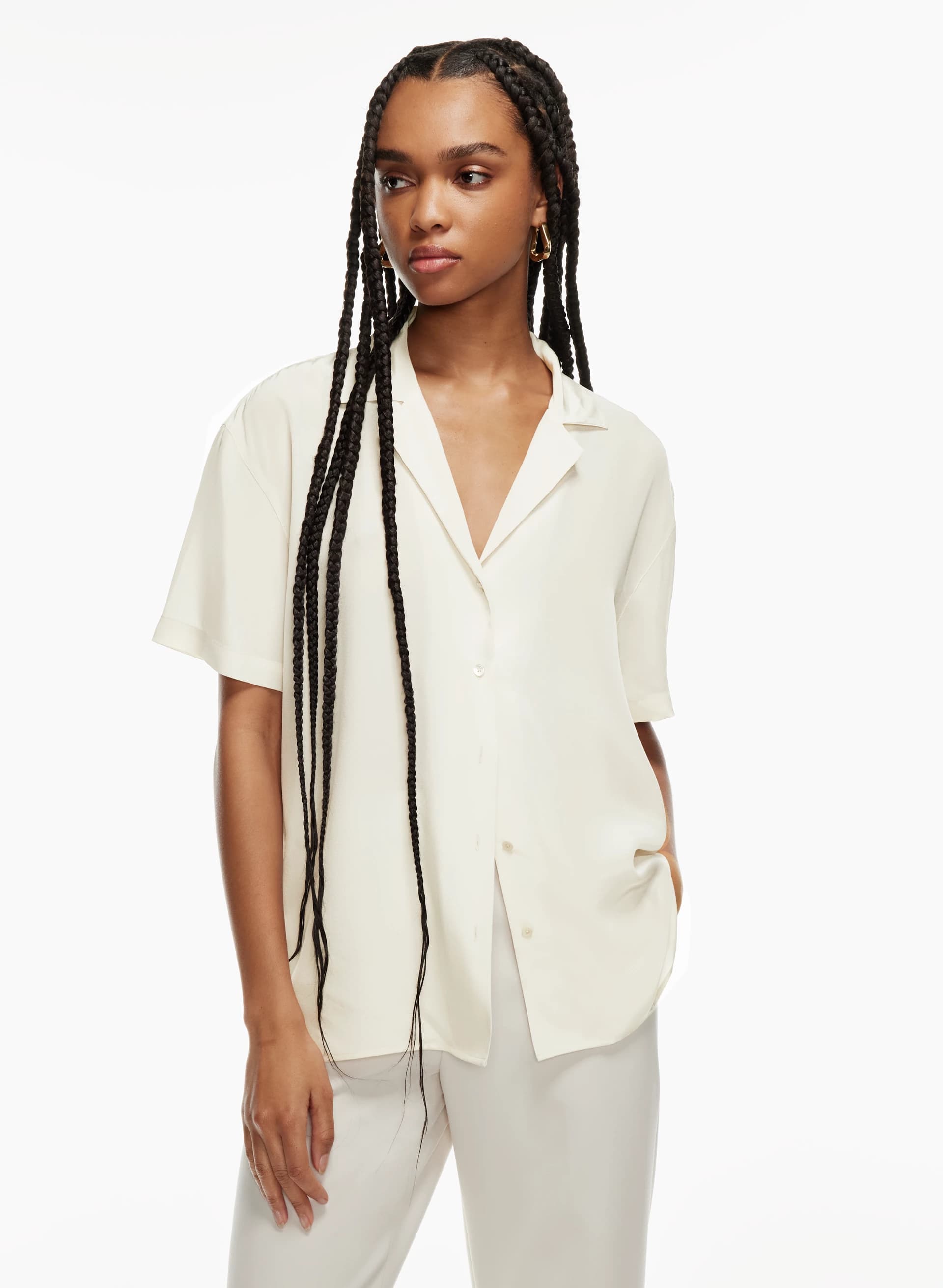 This is a button-up blouse with a notched collar and dropped shoulders. It's made from lightweight, drapey 100% silk.
