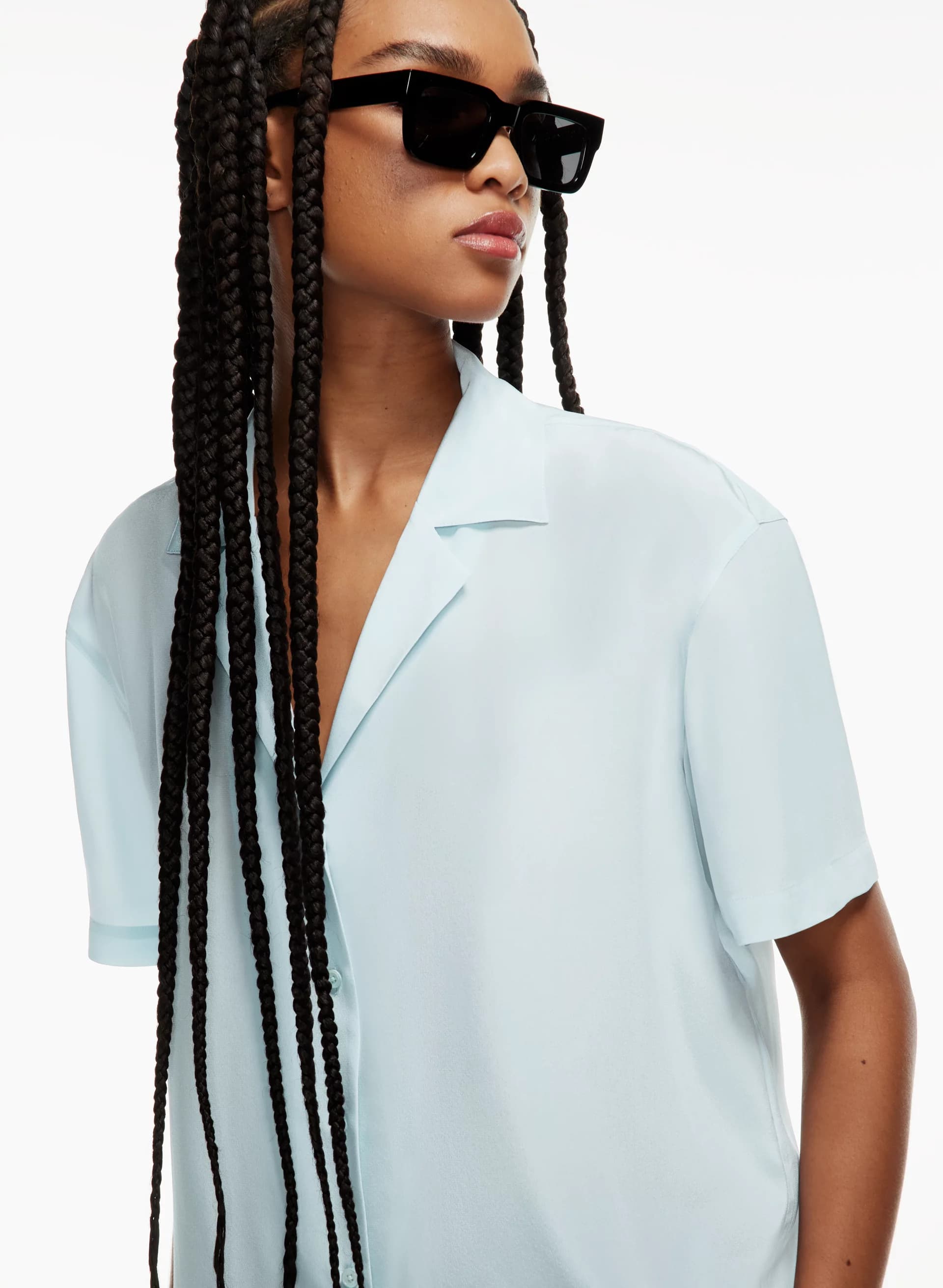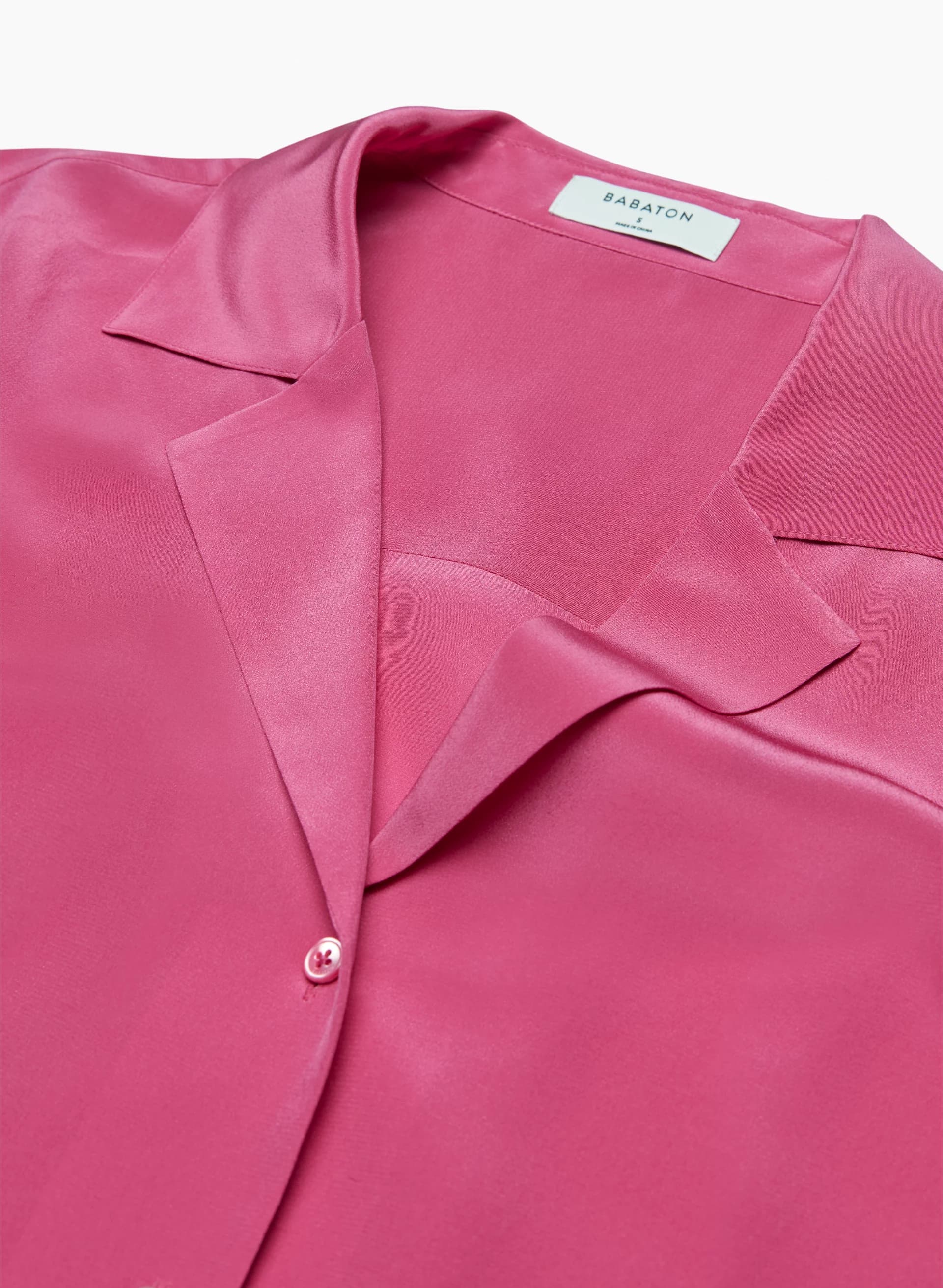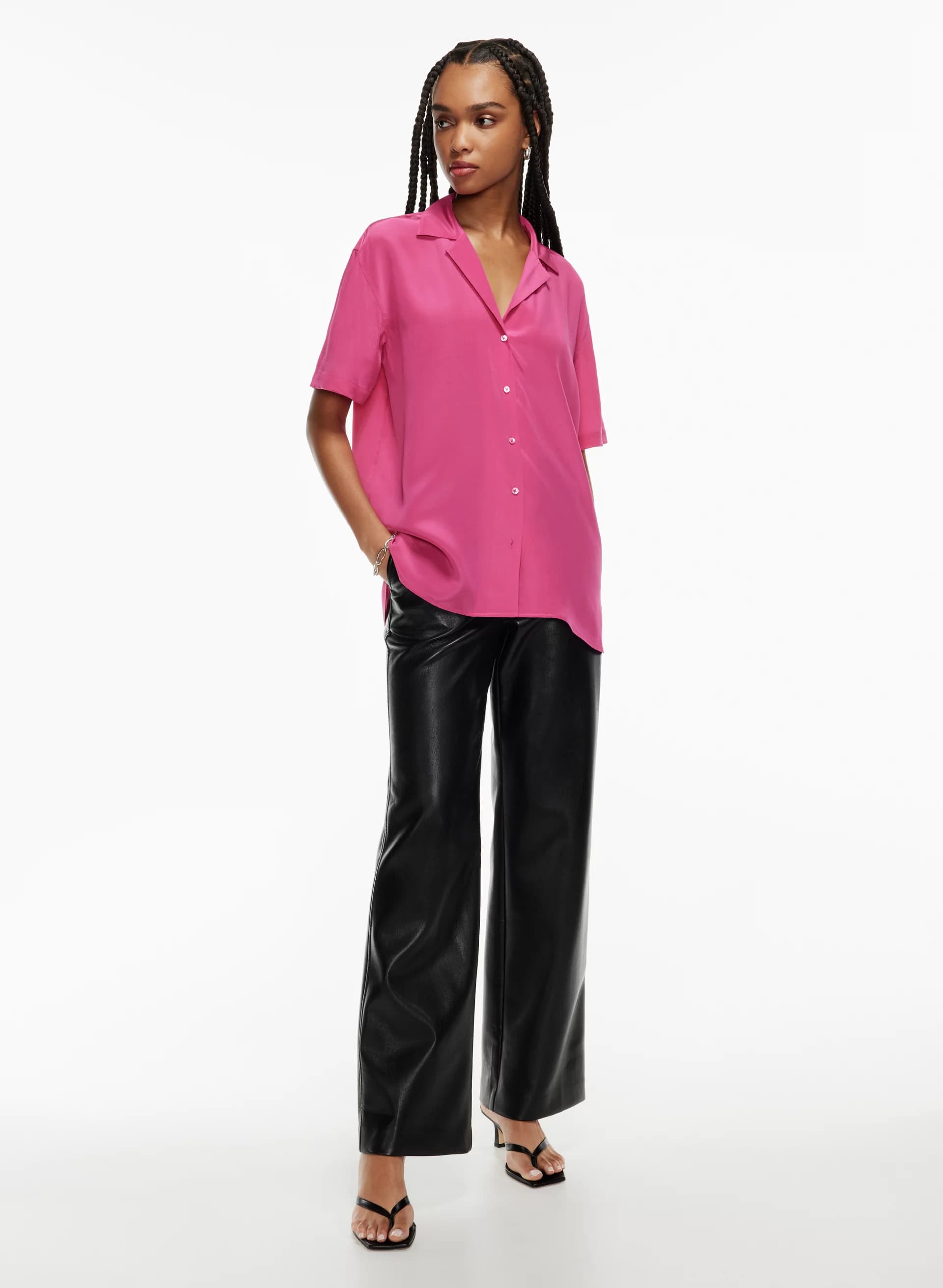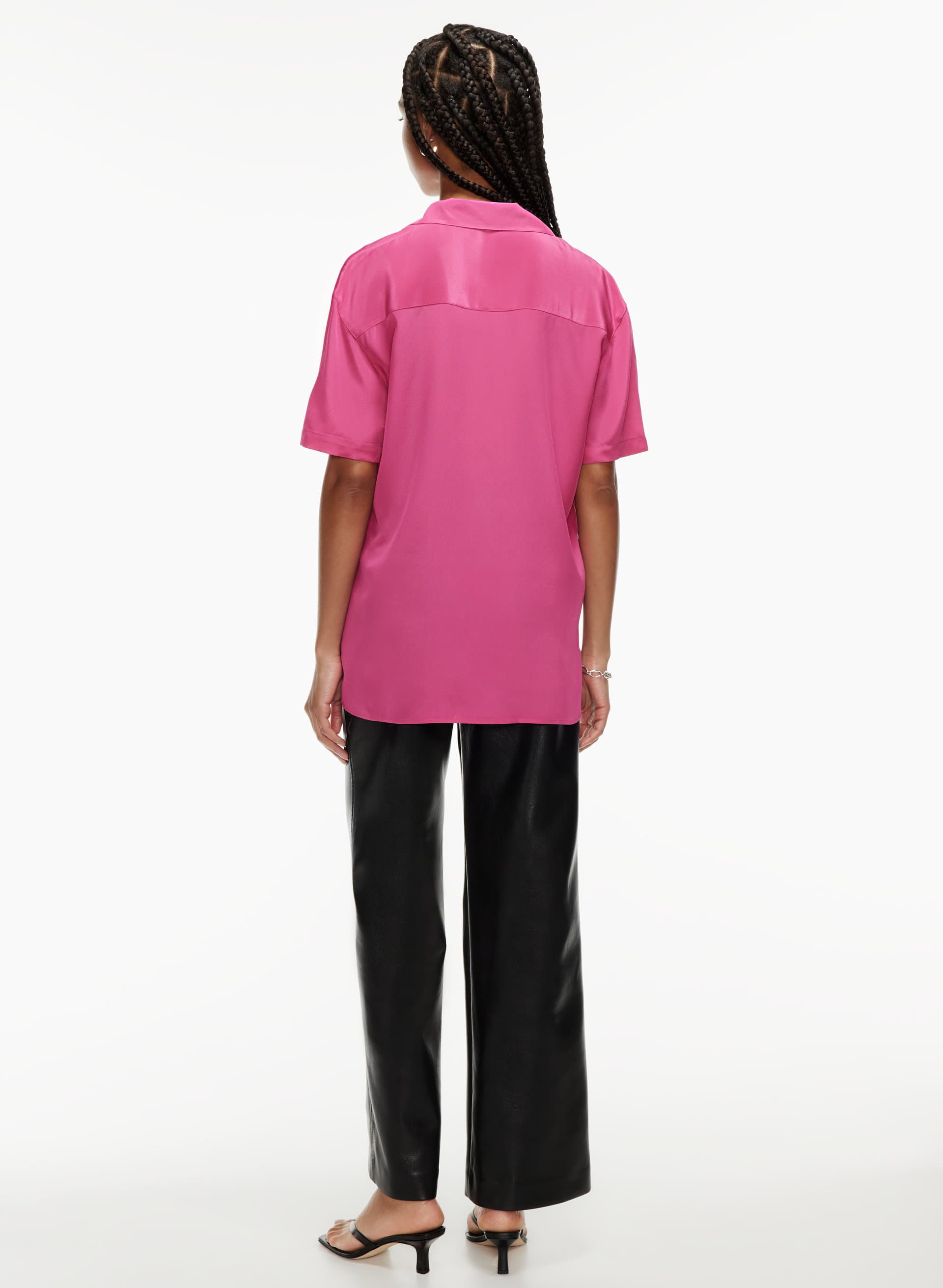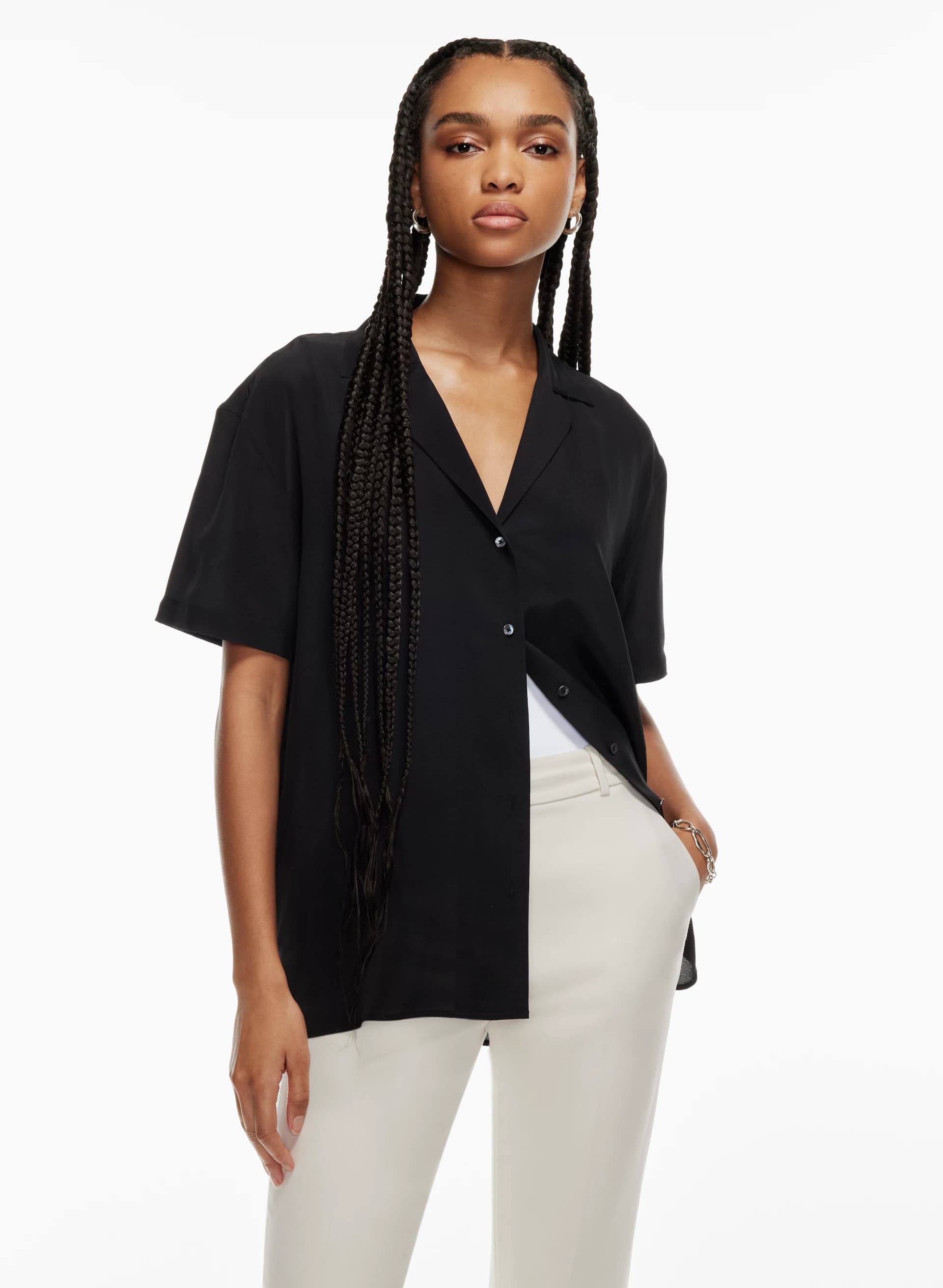This is a button-up blouse with a notched collar and dropped shoulders. It's made from lightweight, drapey 100% silk.