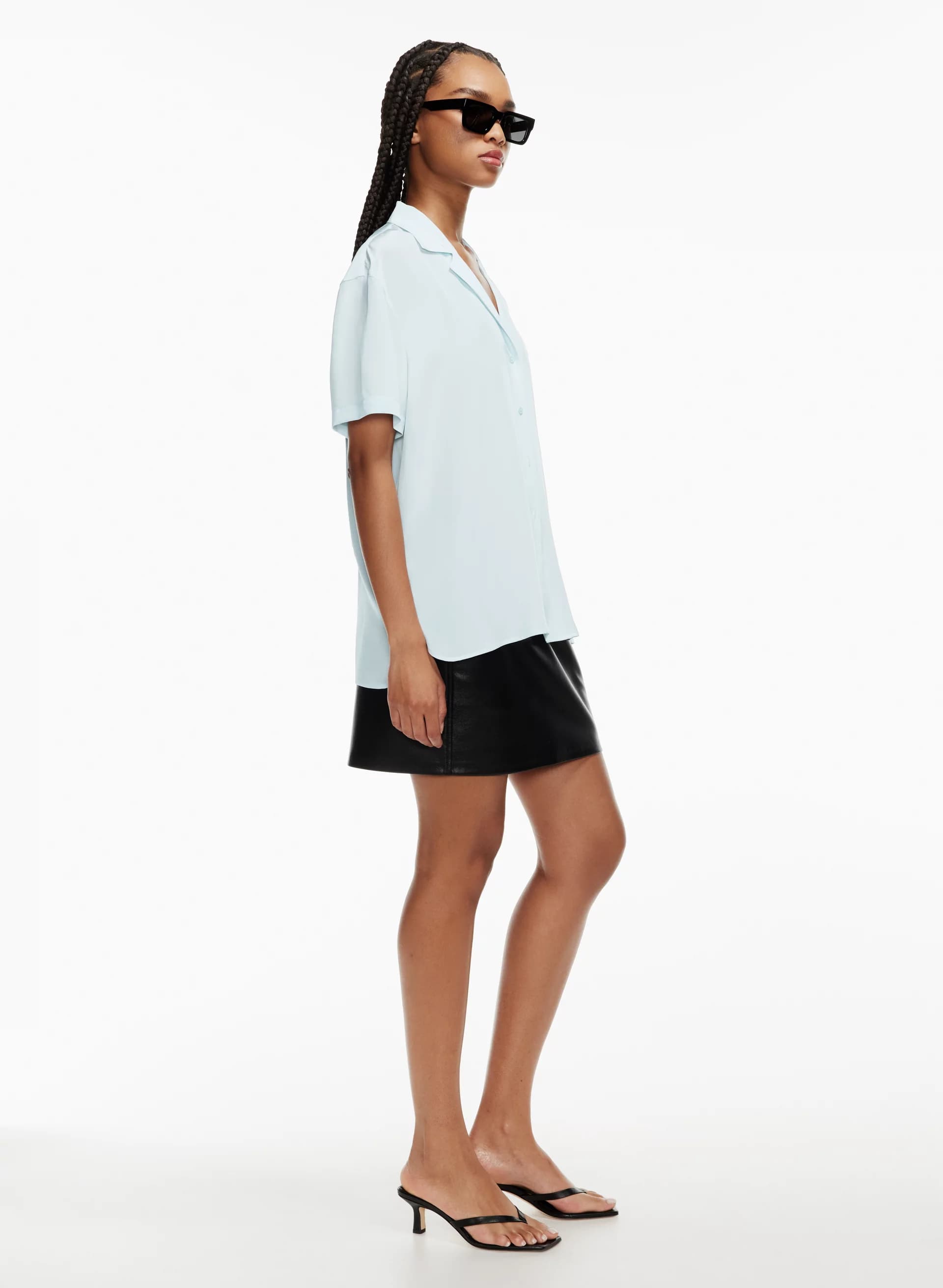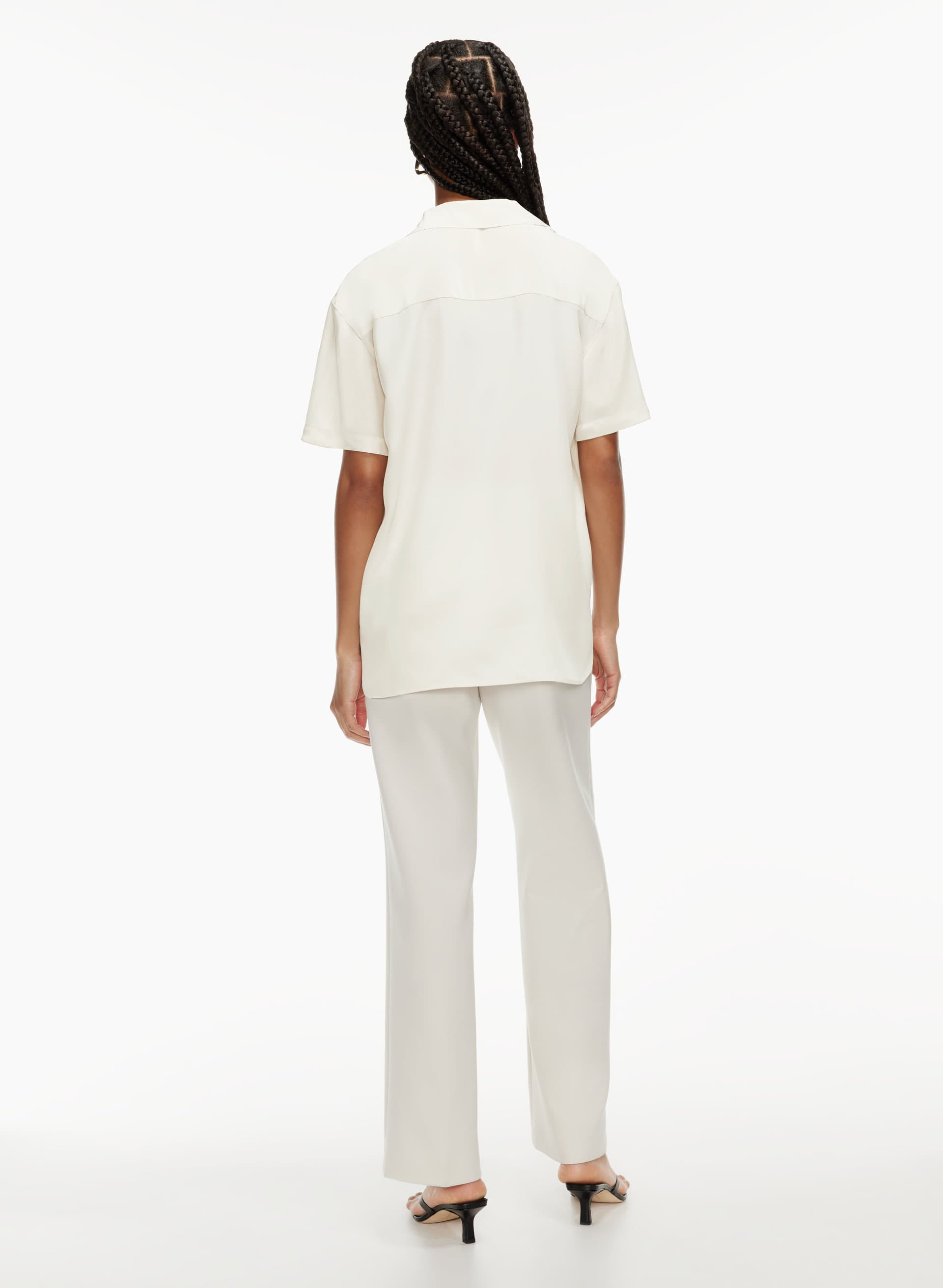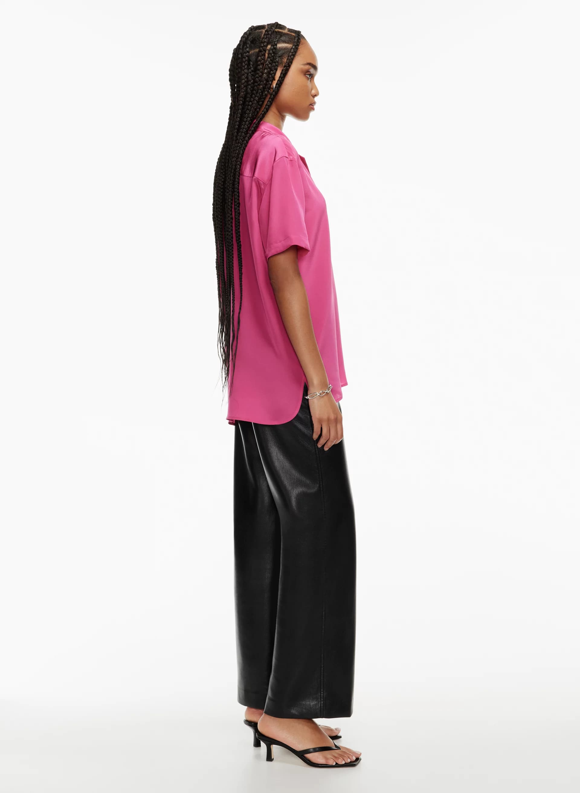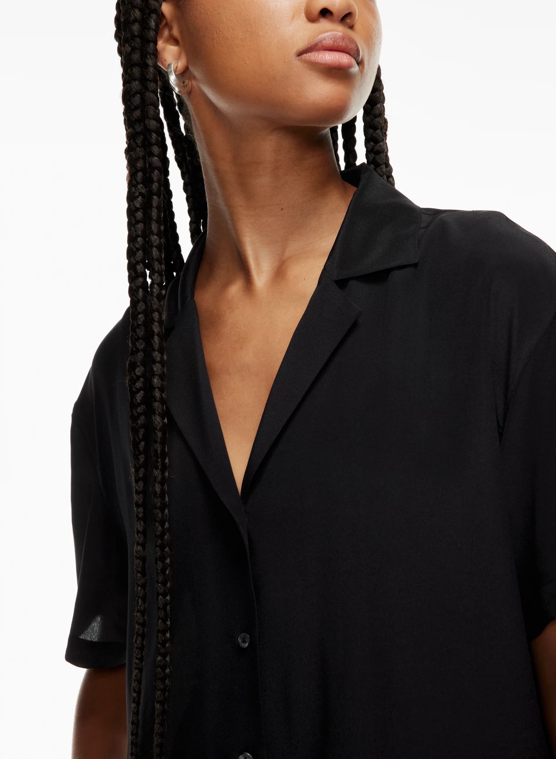 This is a button-up blouse with a notched collar and dropped shoulders. It's made from lightweight, drapey 100% silk.