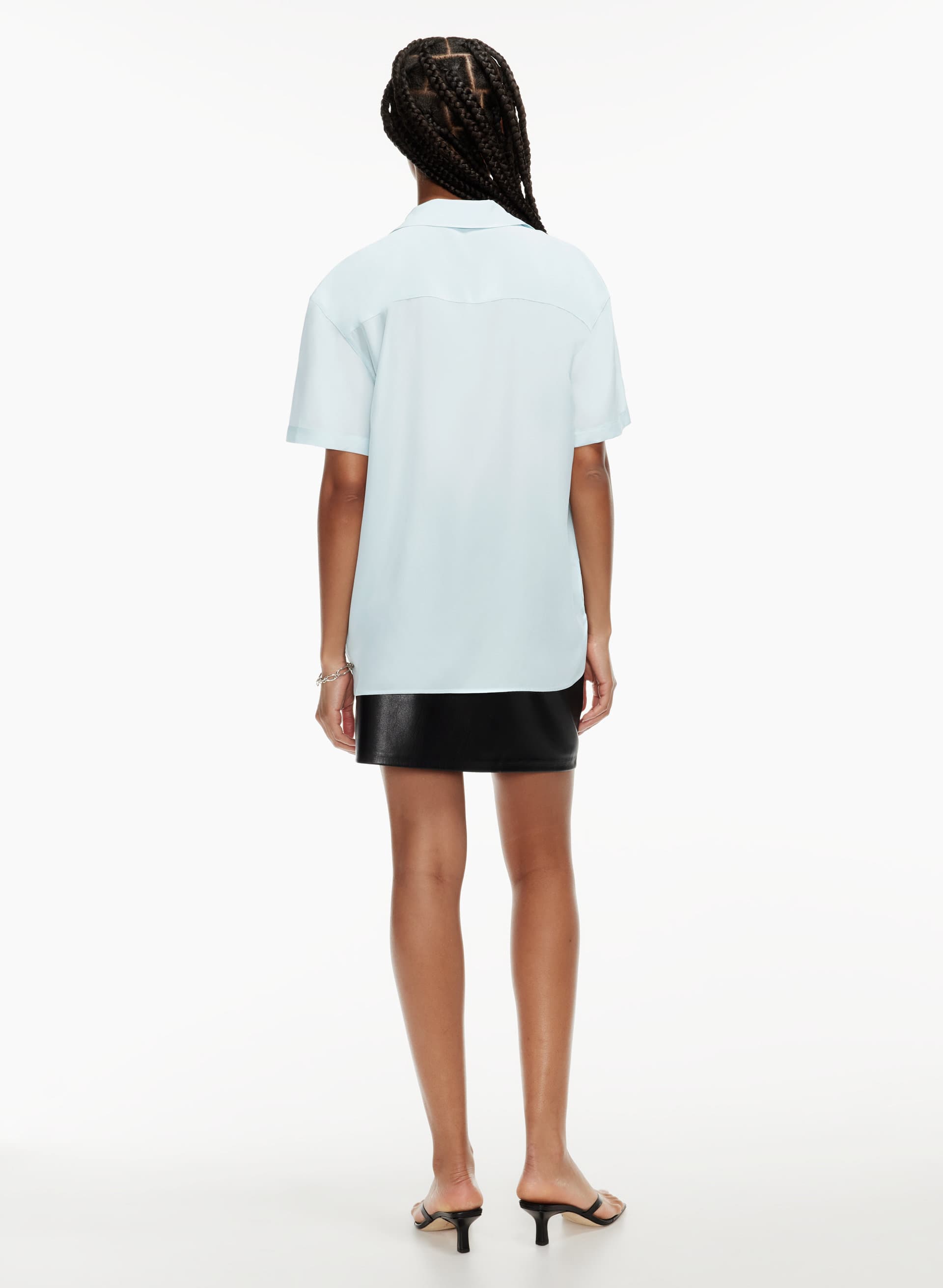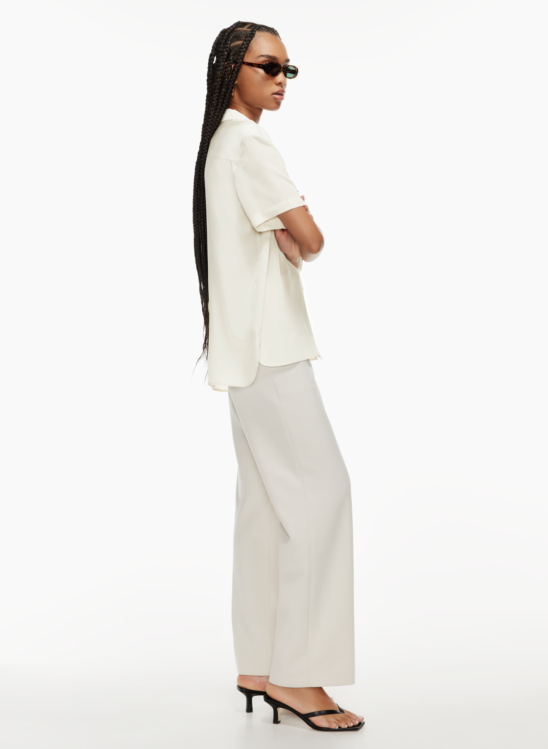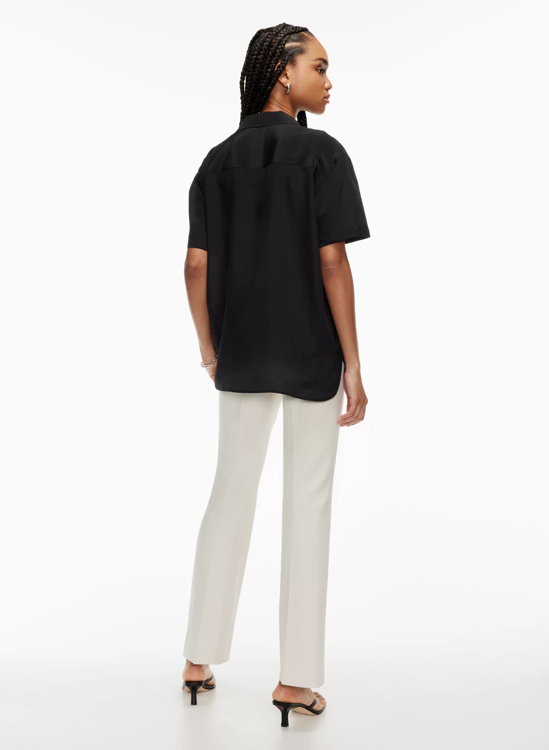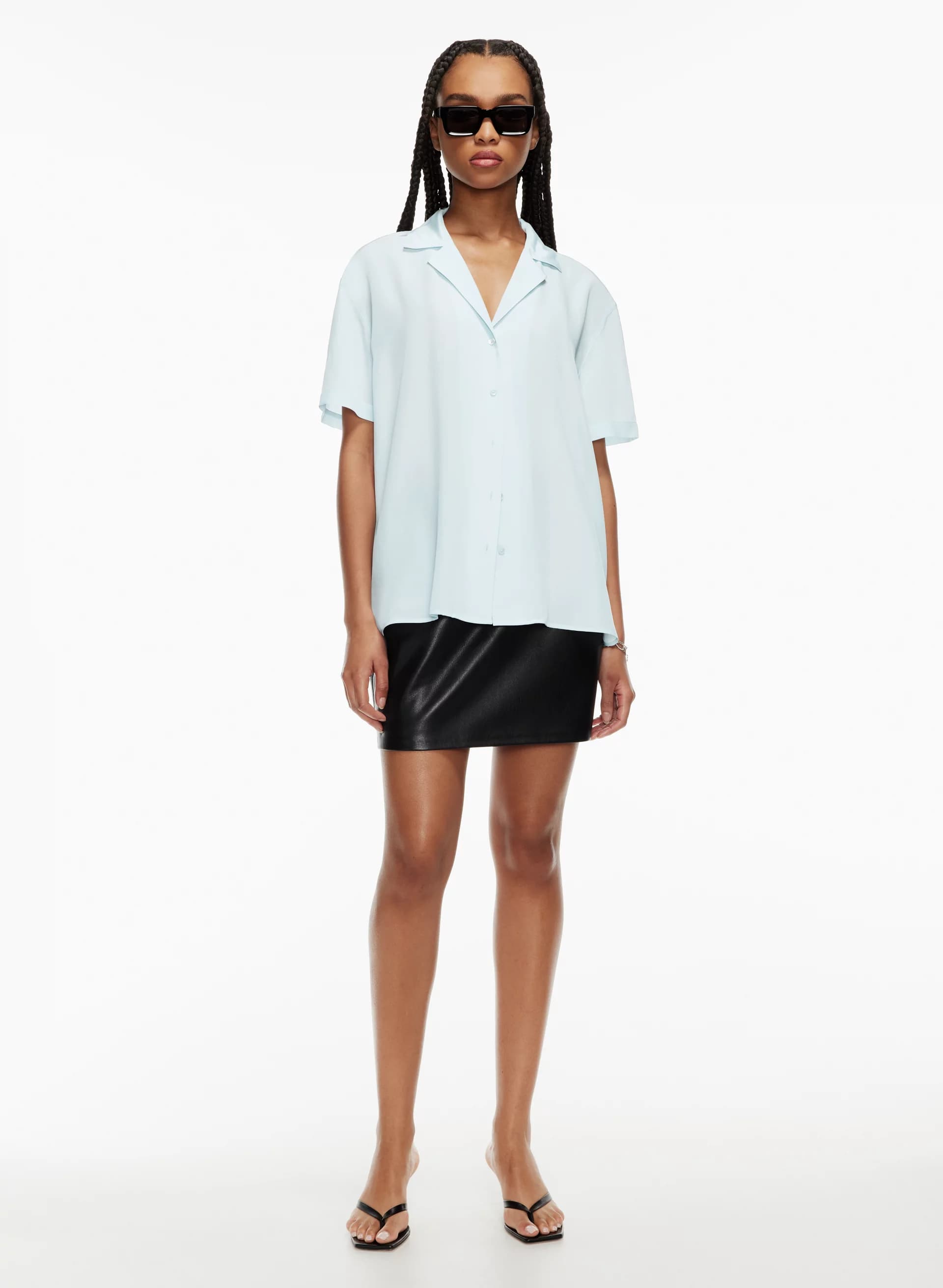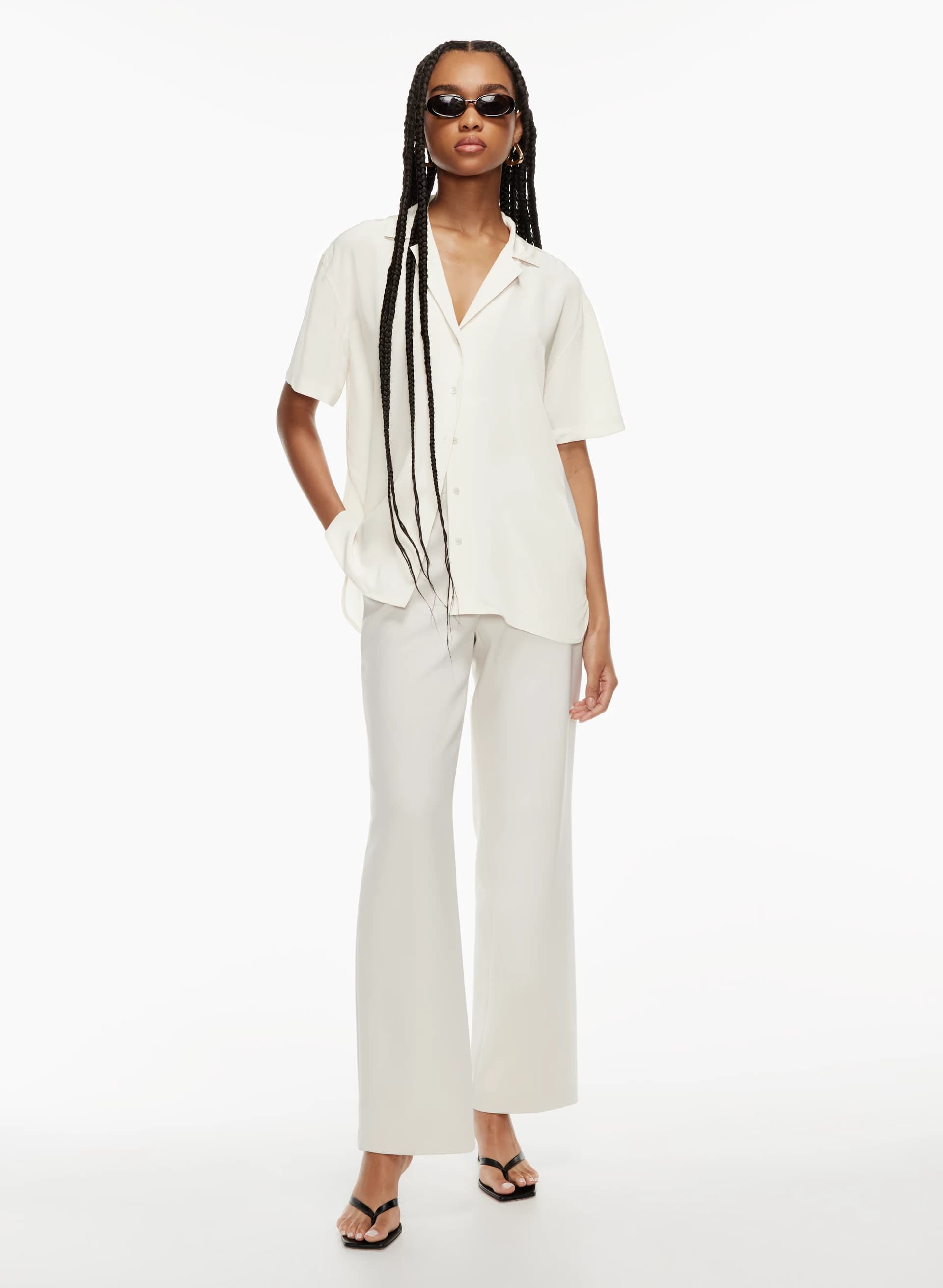 This is a button-up blouse with a notched collar and dropped shoulders. It's made from lightweight, drapey 100% silk.