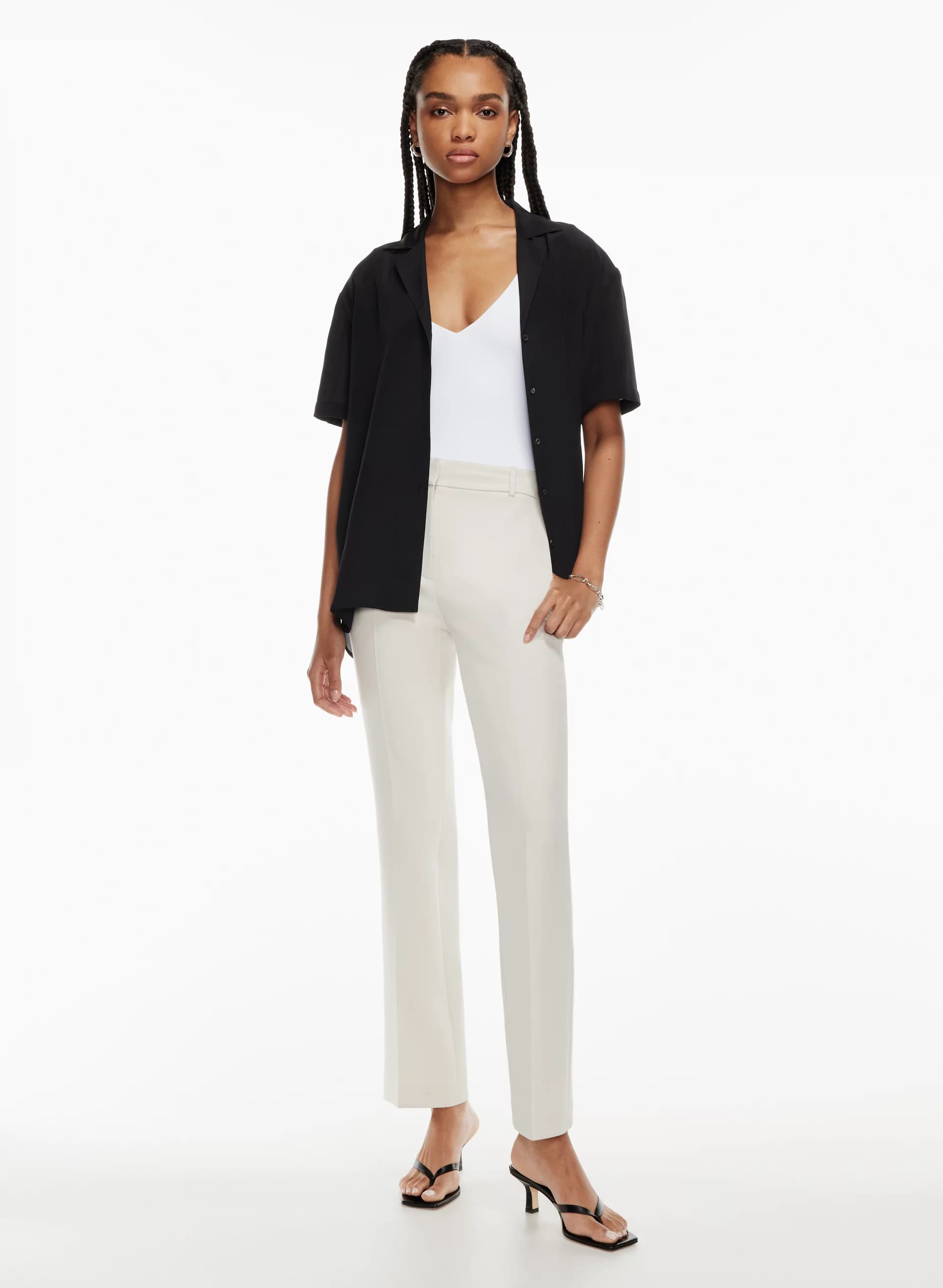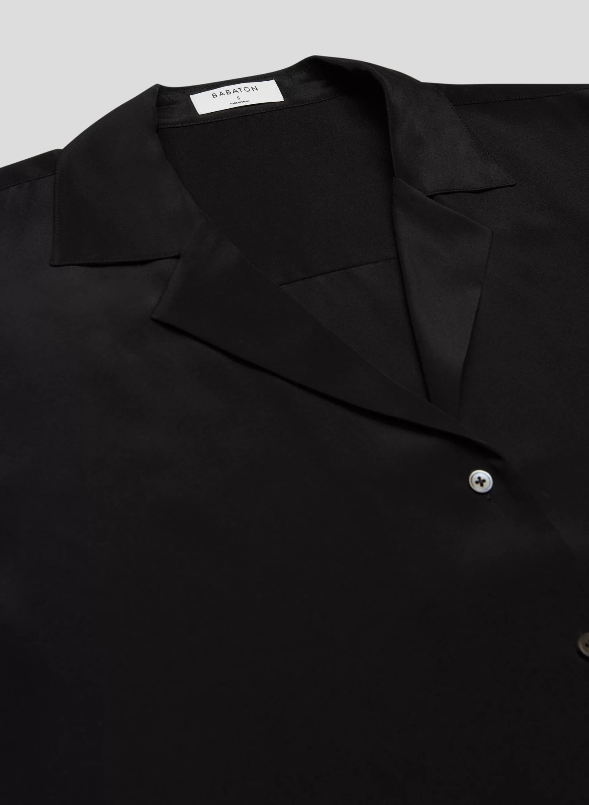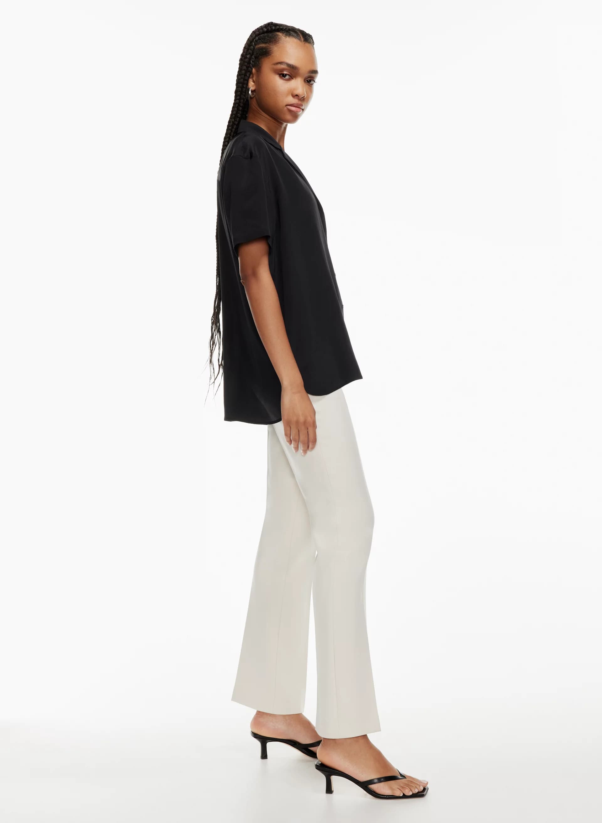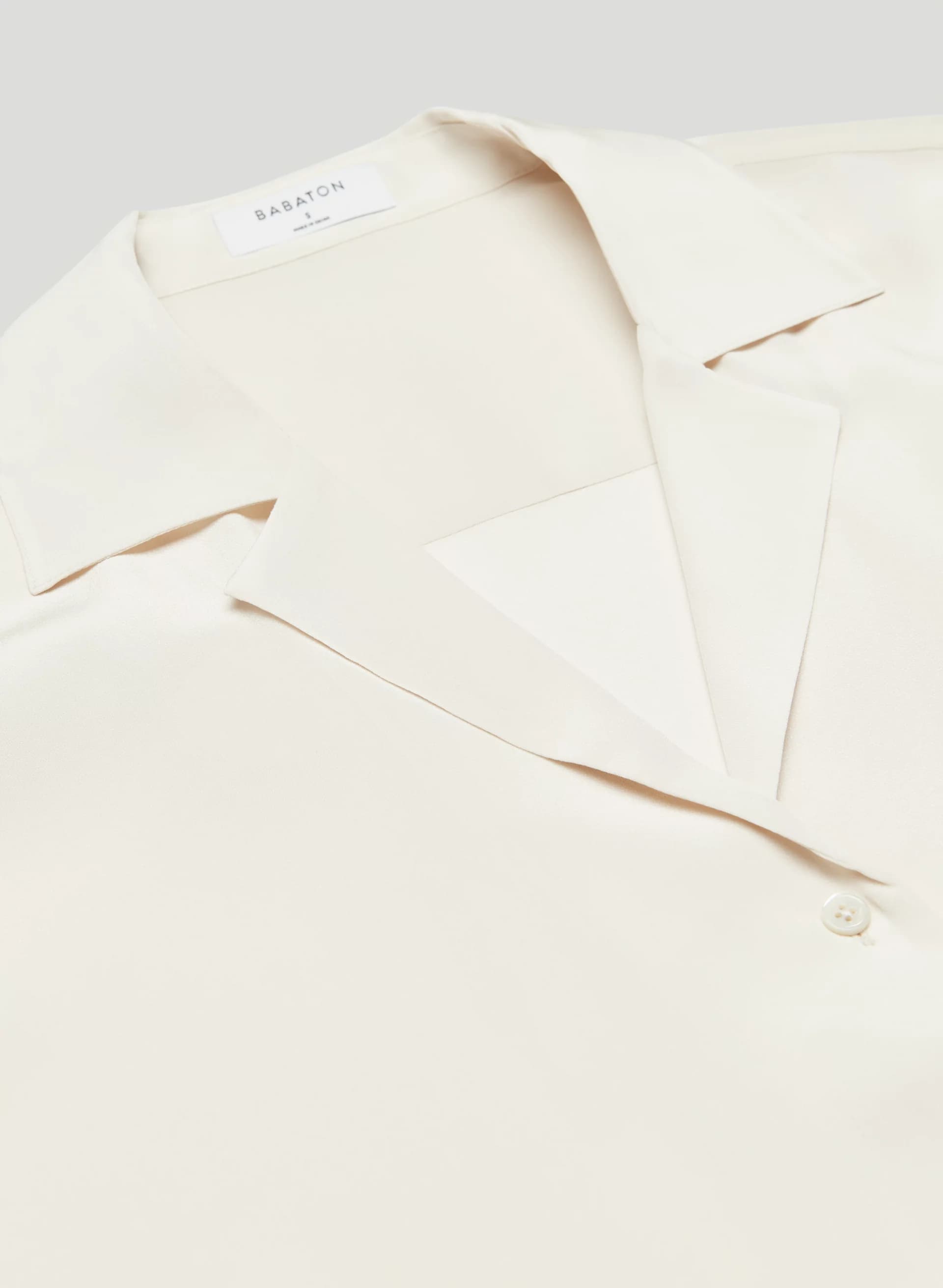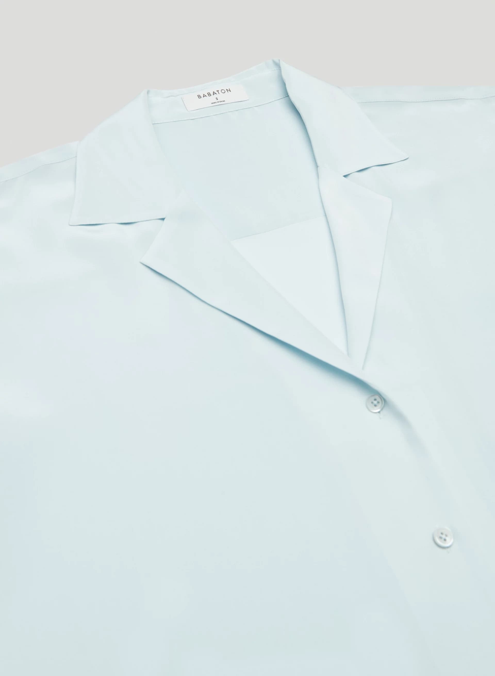 This is a button-up blouse with a notched collar and dropped shoulders. It's made from lightweight, drapey 100% silk.