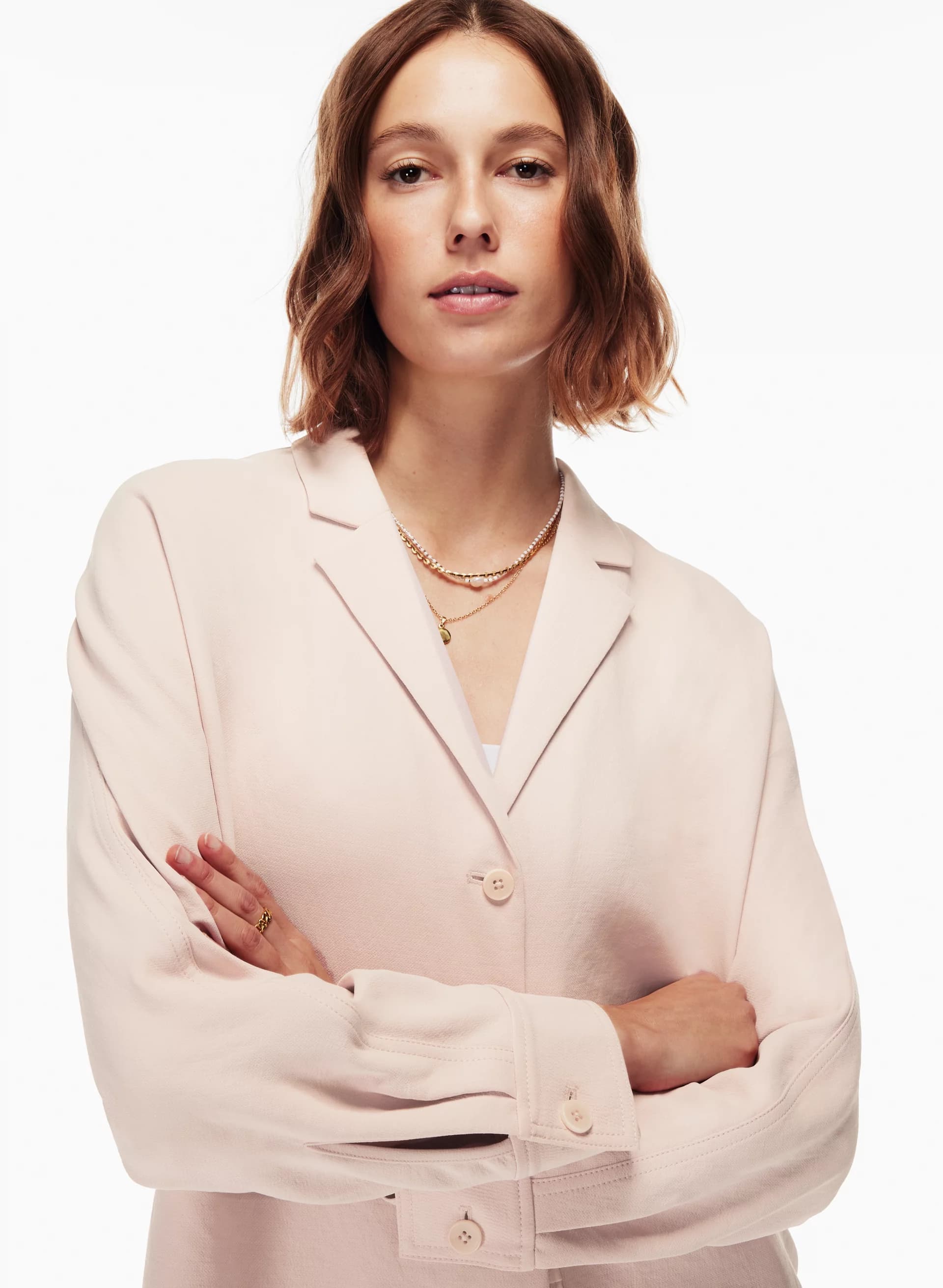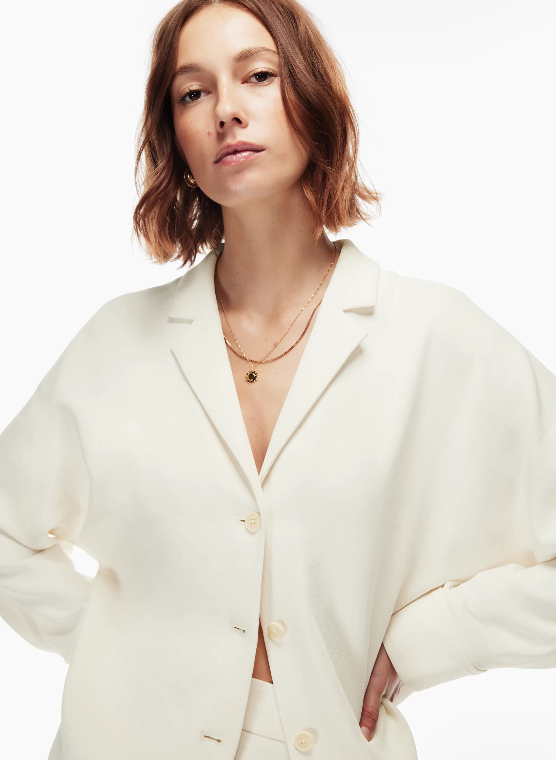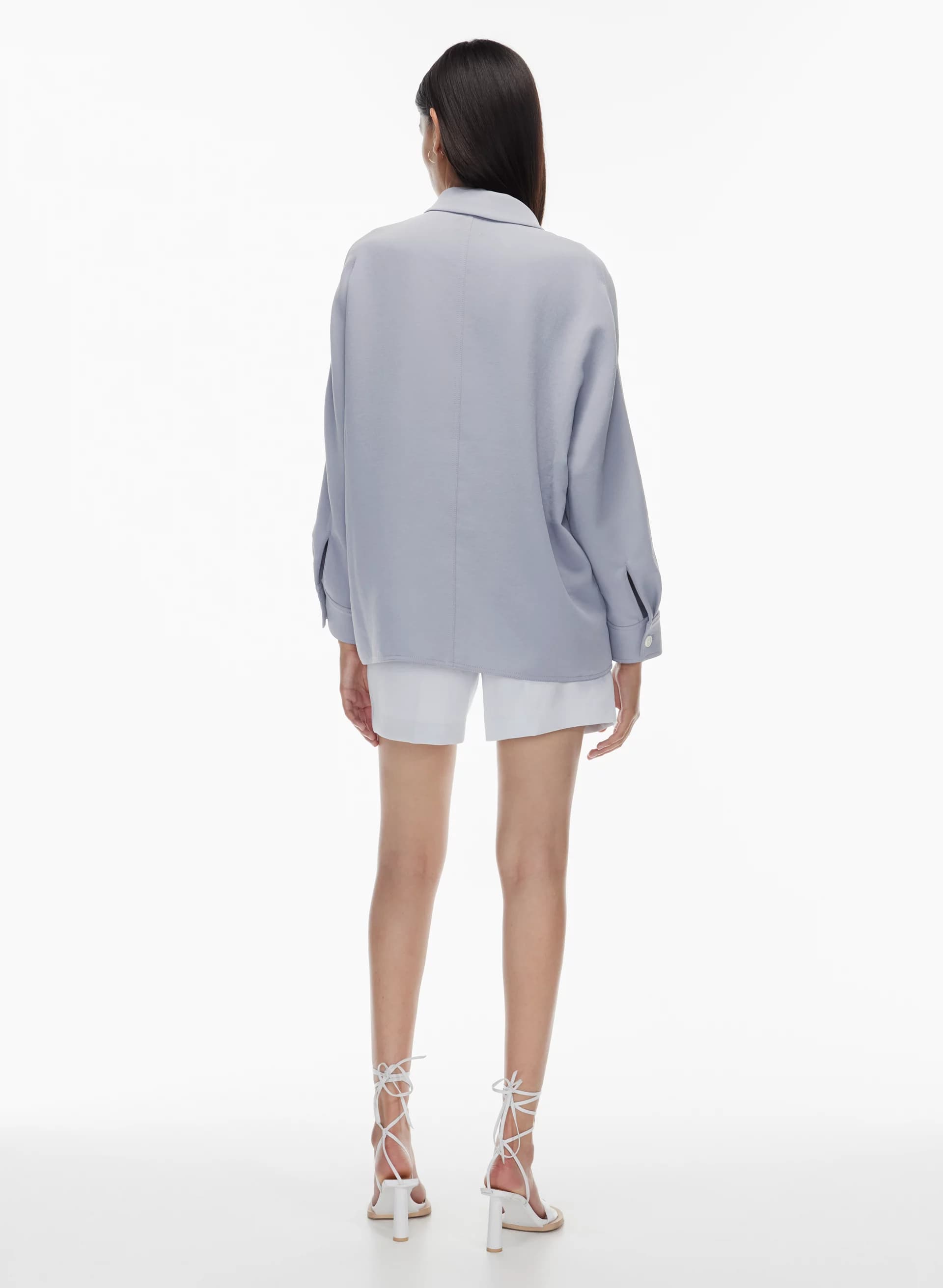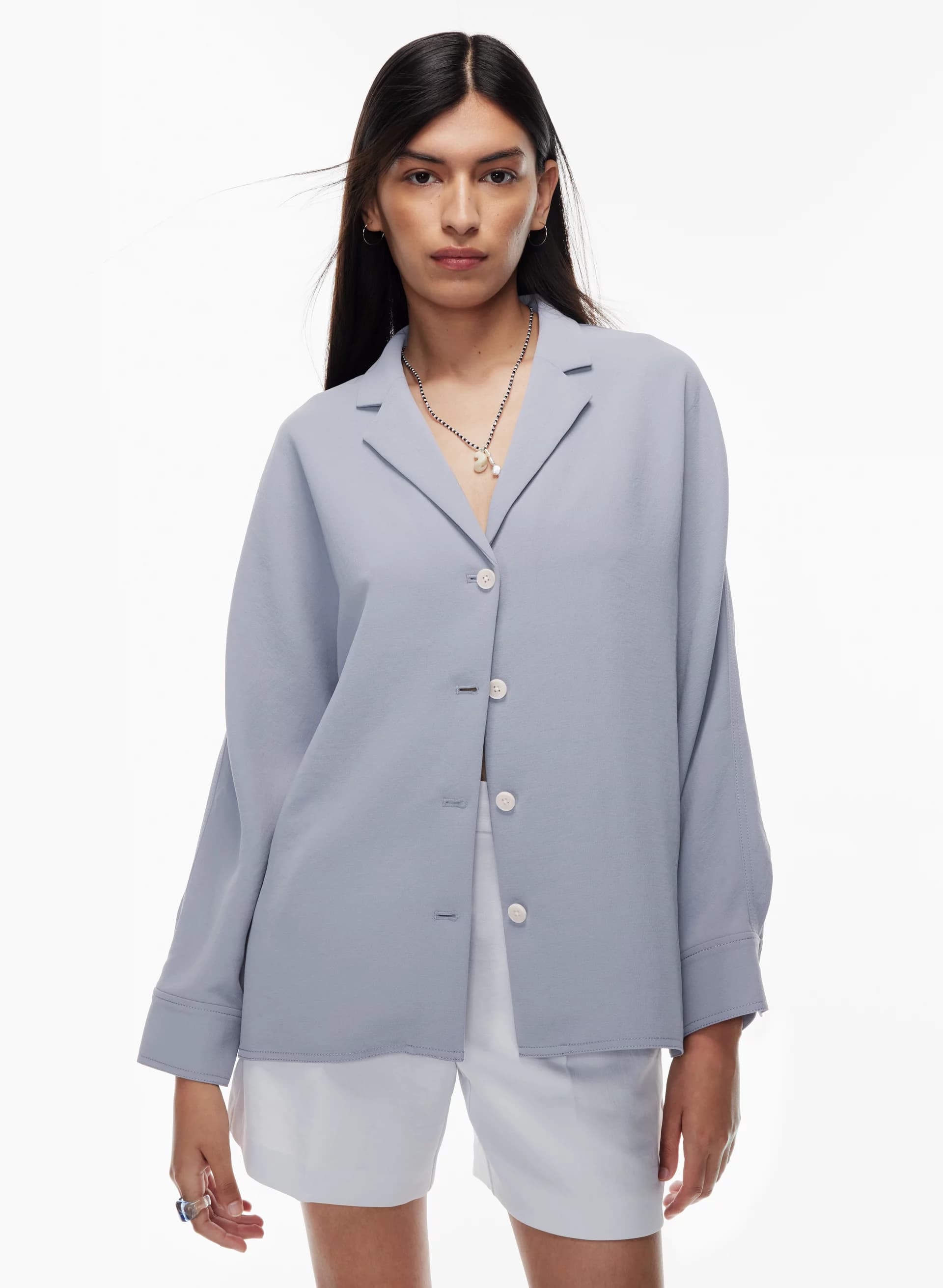 This is a button-up shirt with long dolman sleeves and a notched collar. It’s made from Crepette — a drapey crepe fabric from Japan with a matte finish.