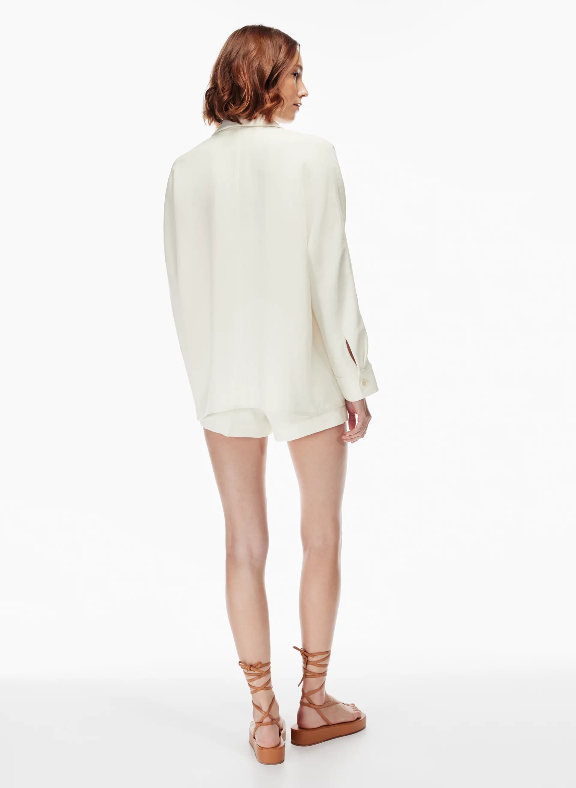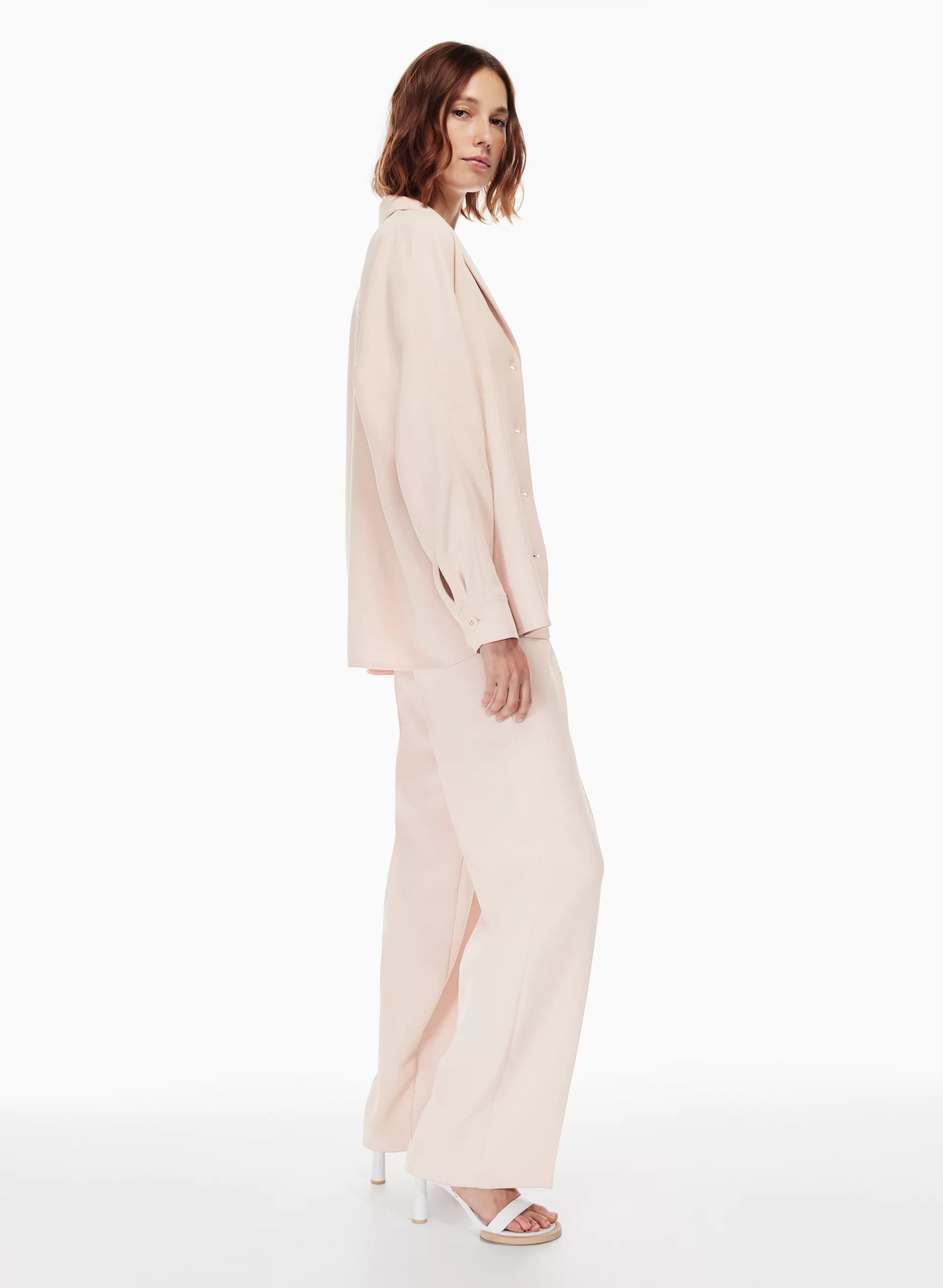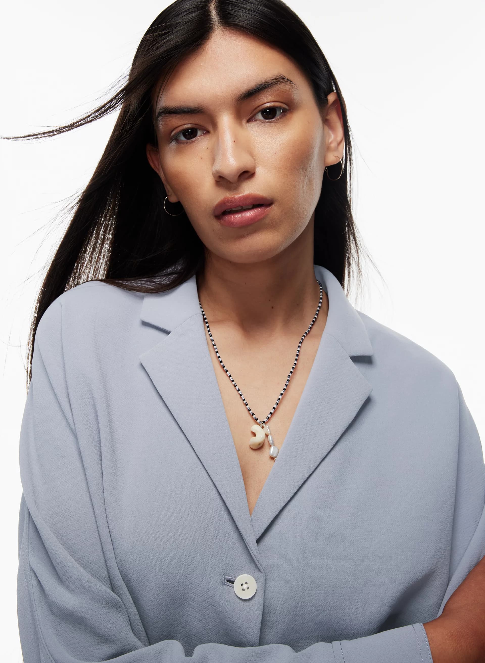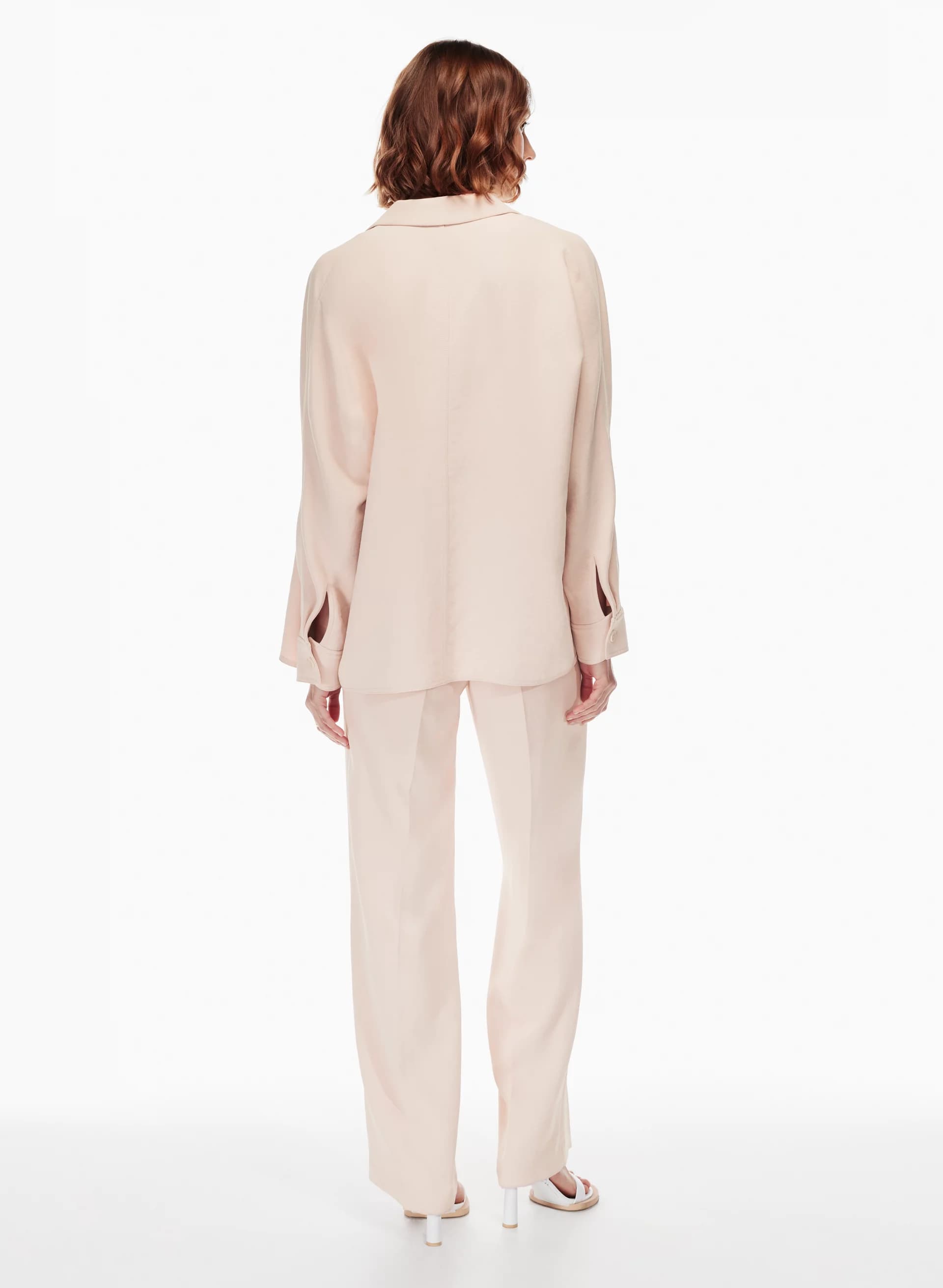 This is a button-up shirt with long dolman sleeves and a notched collar. It’s made from Crepette — a drapey crepe fabric from Japan with a matte finish.