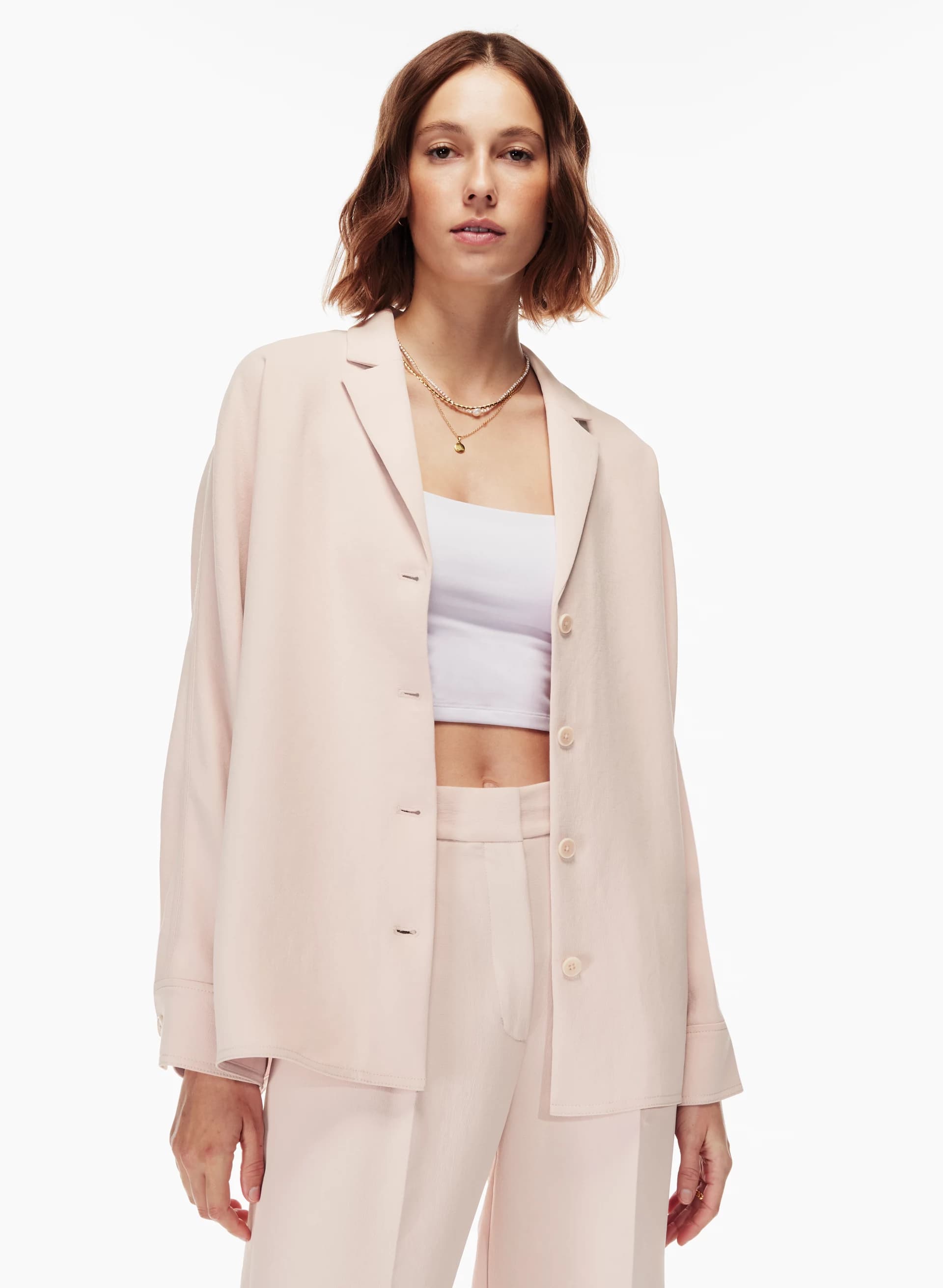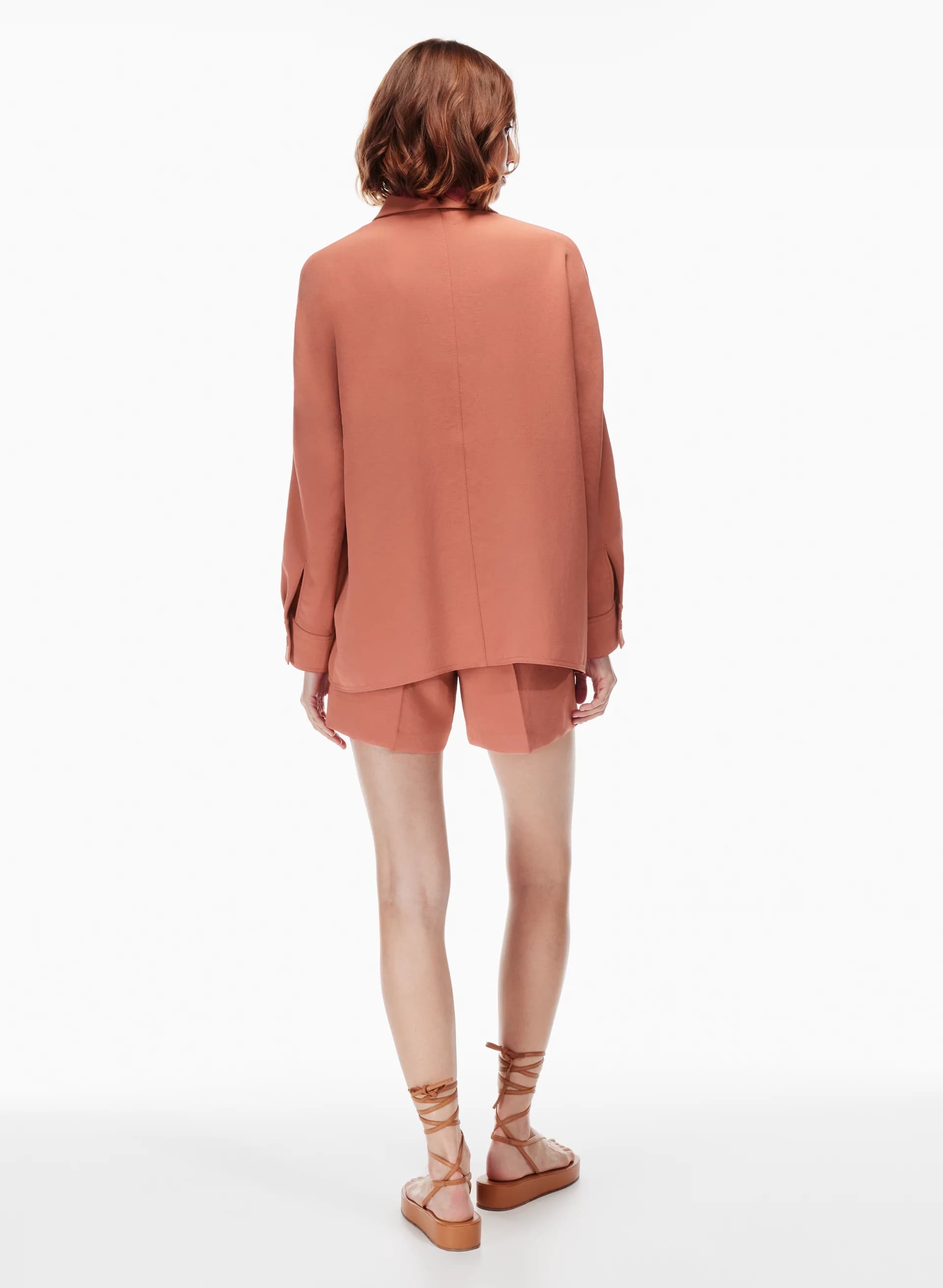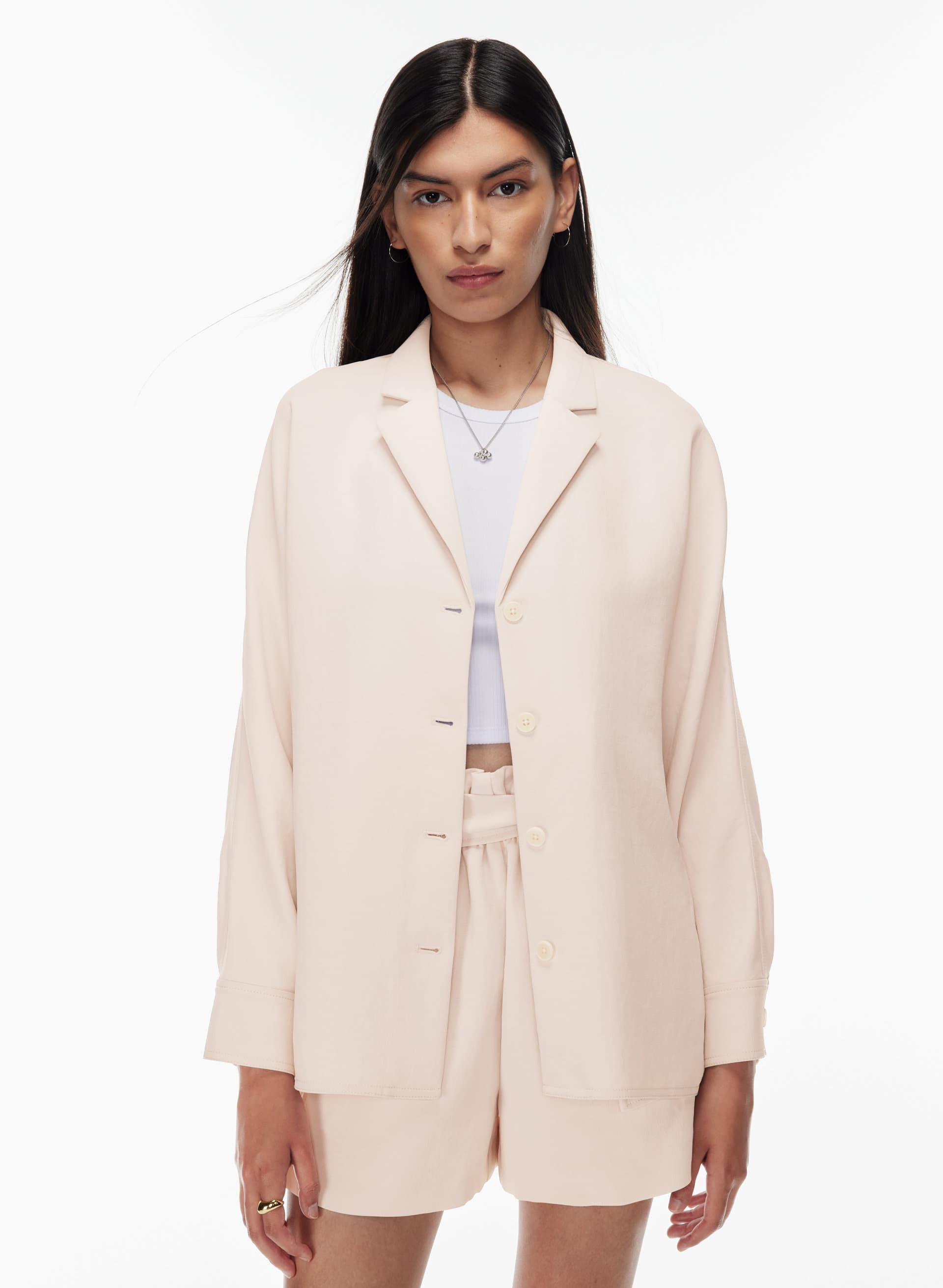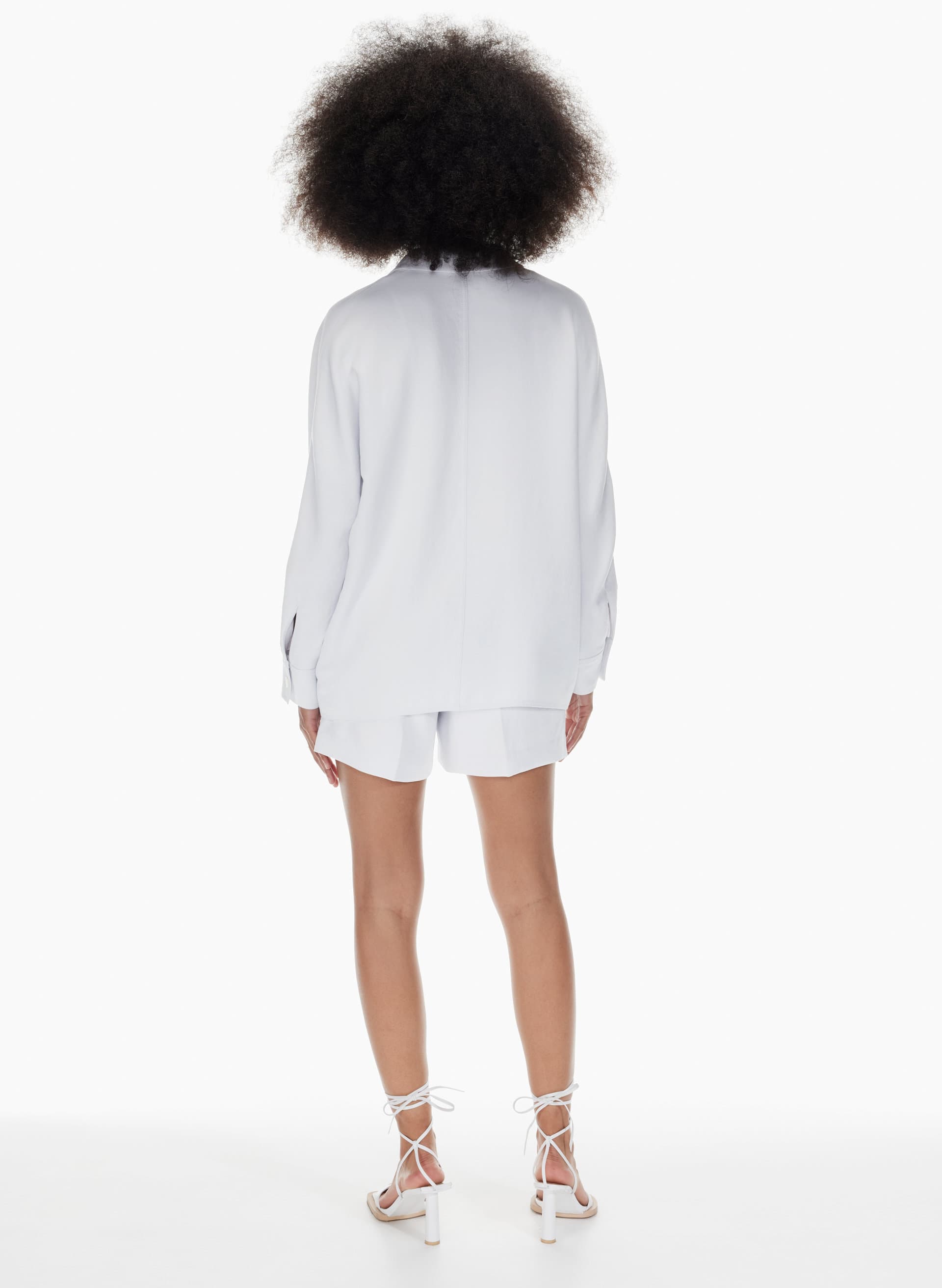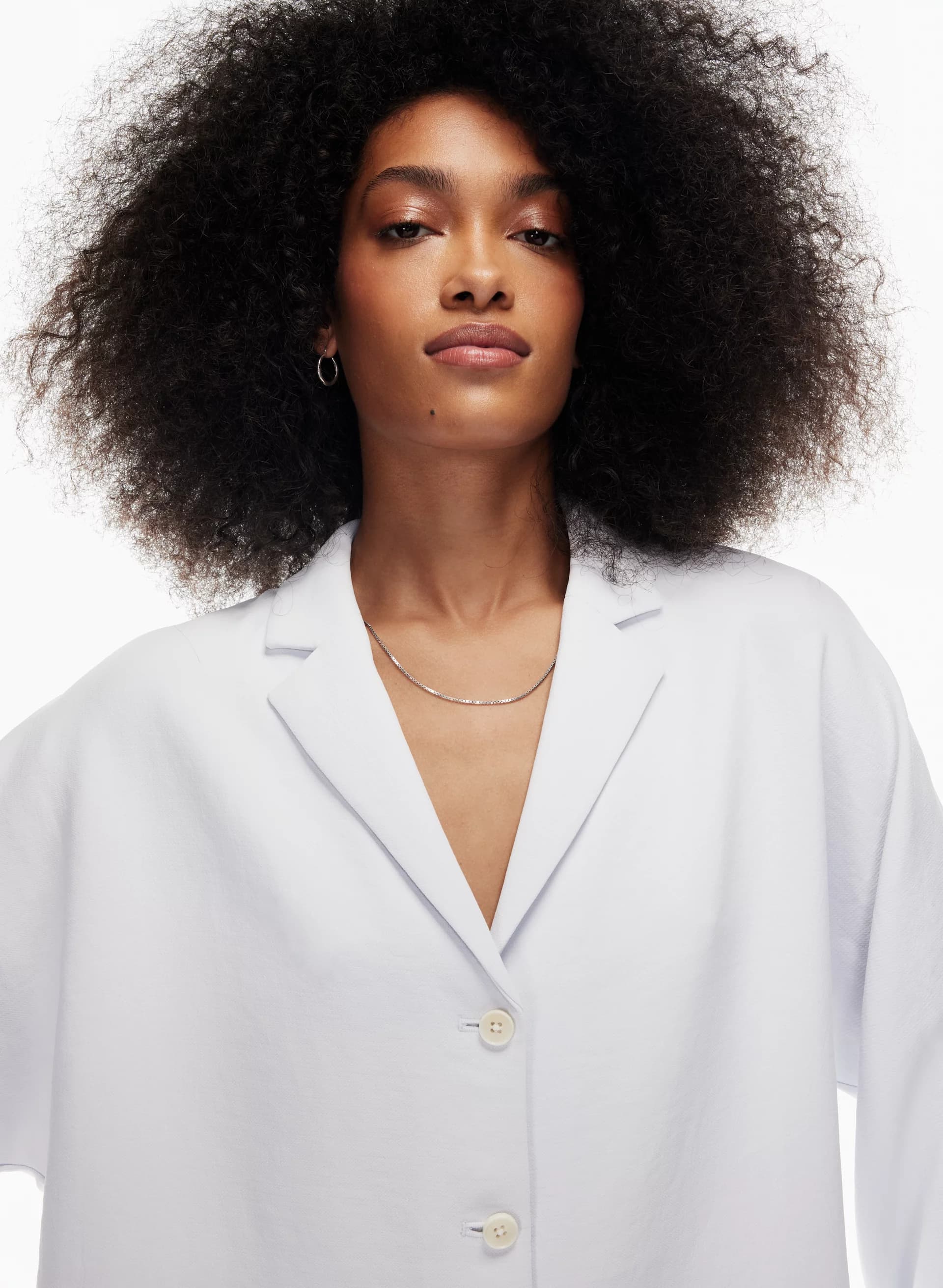 This is a button-up shirt with long dolman sleeves and a notched collar. It’s made from Crepette — a drapey crepe fabric from Japan with a matte finish.