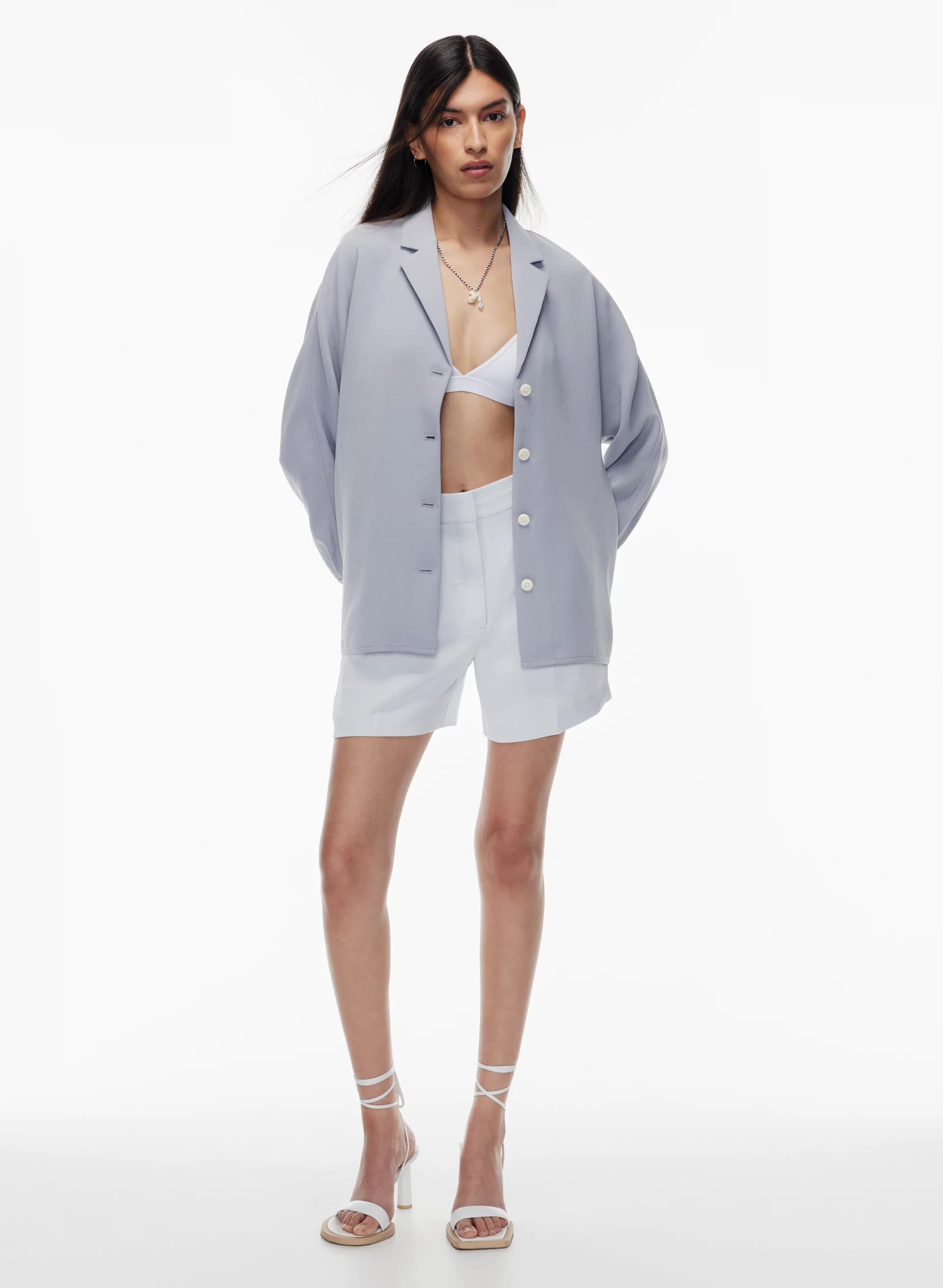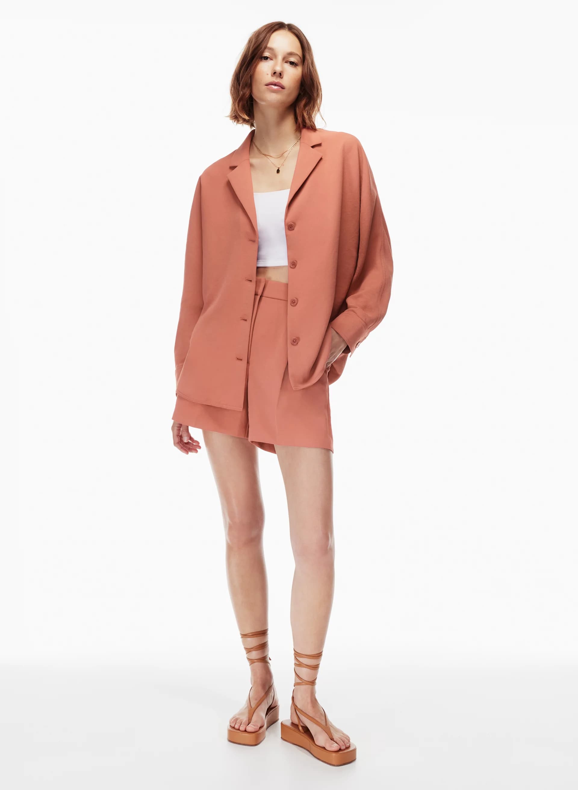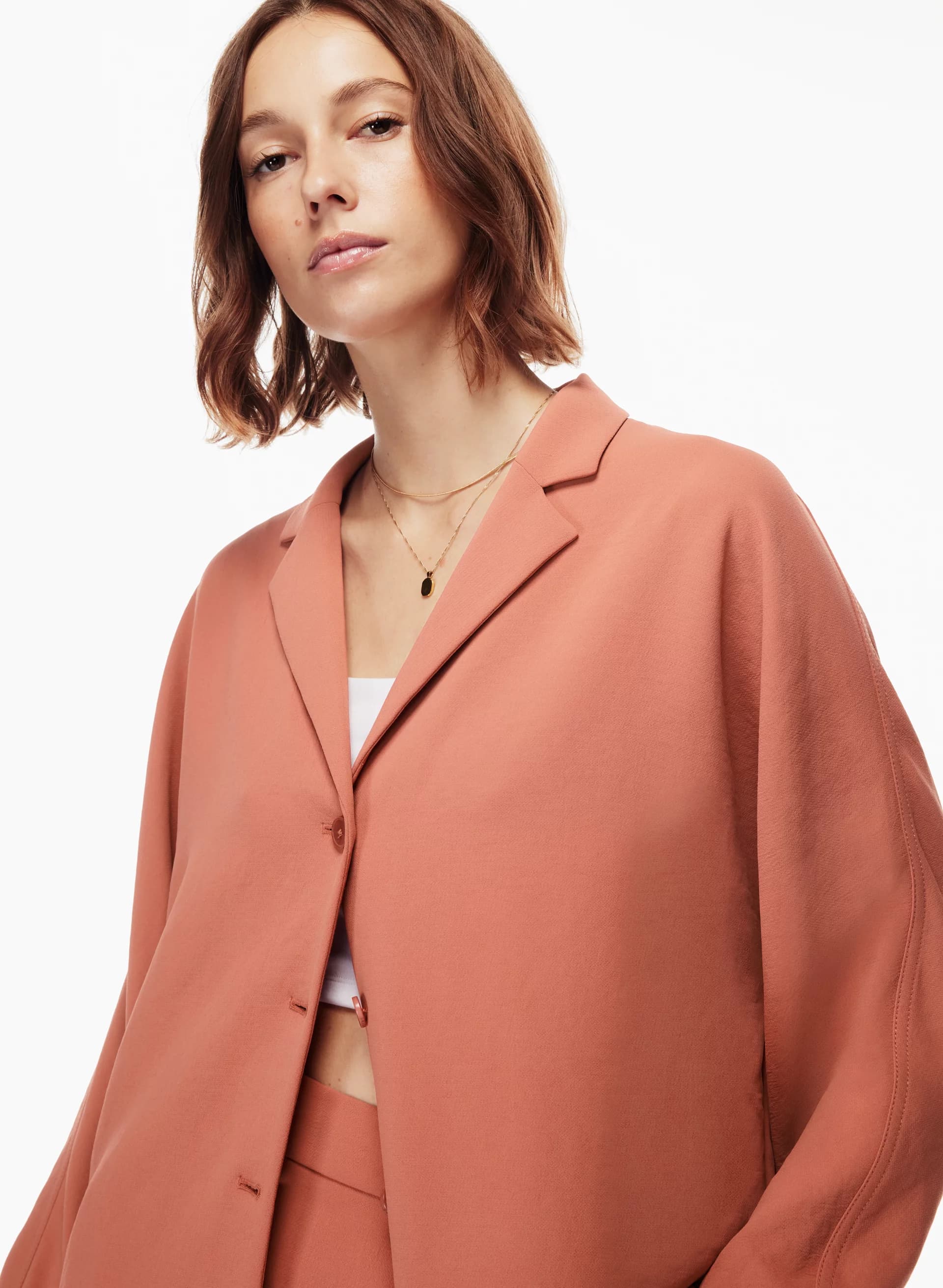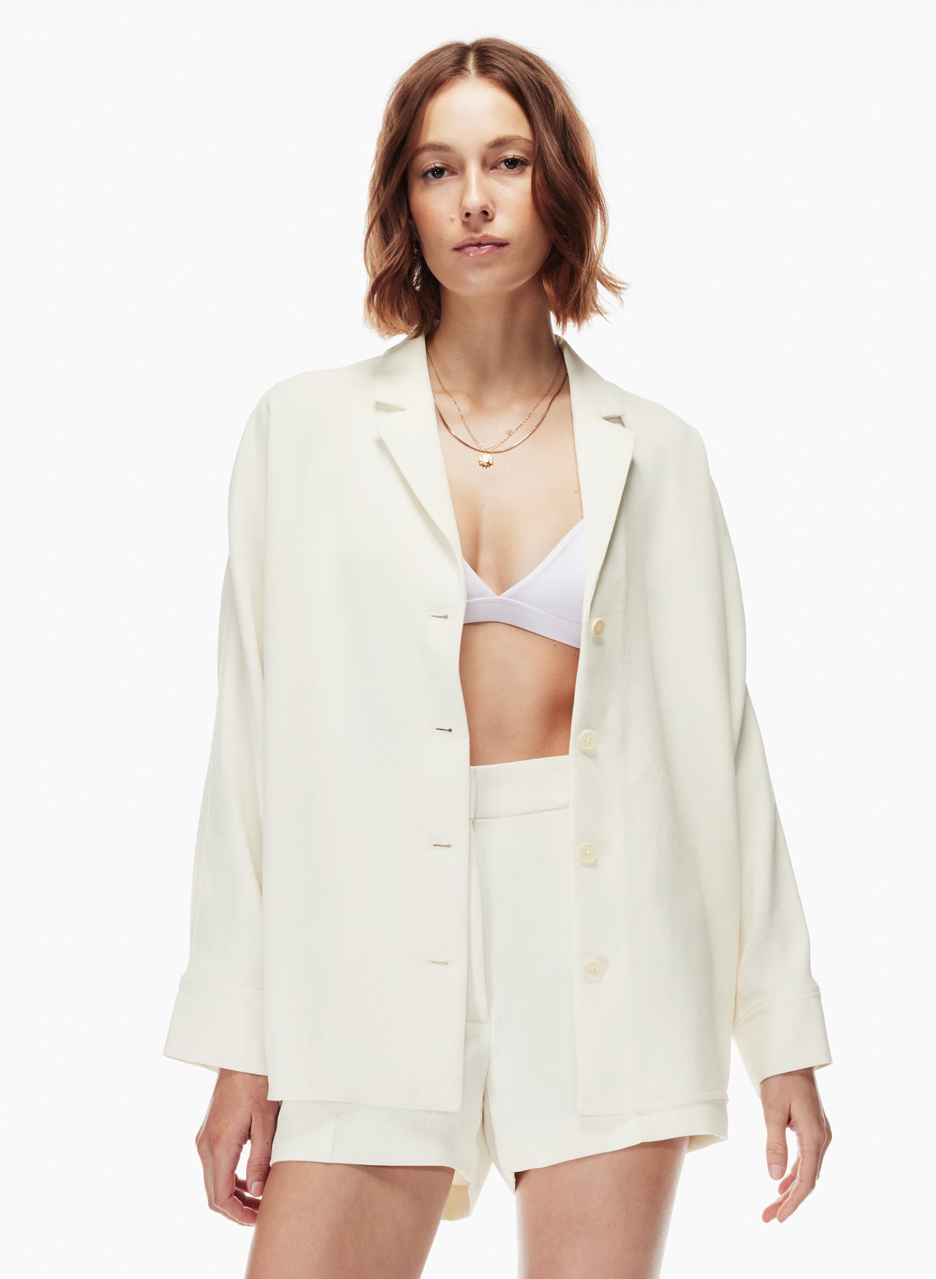 This is a button-up shirt with long dolman sleeves and a notched collar. It’s made from Crepette — a drapey crepe fabric from Japan with a matte finish.