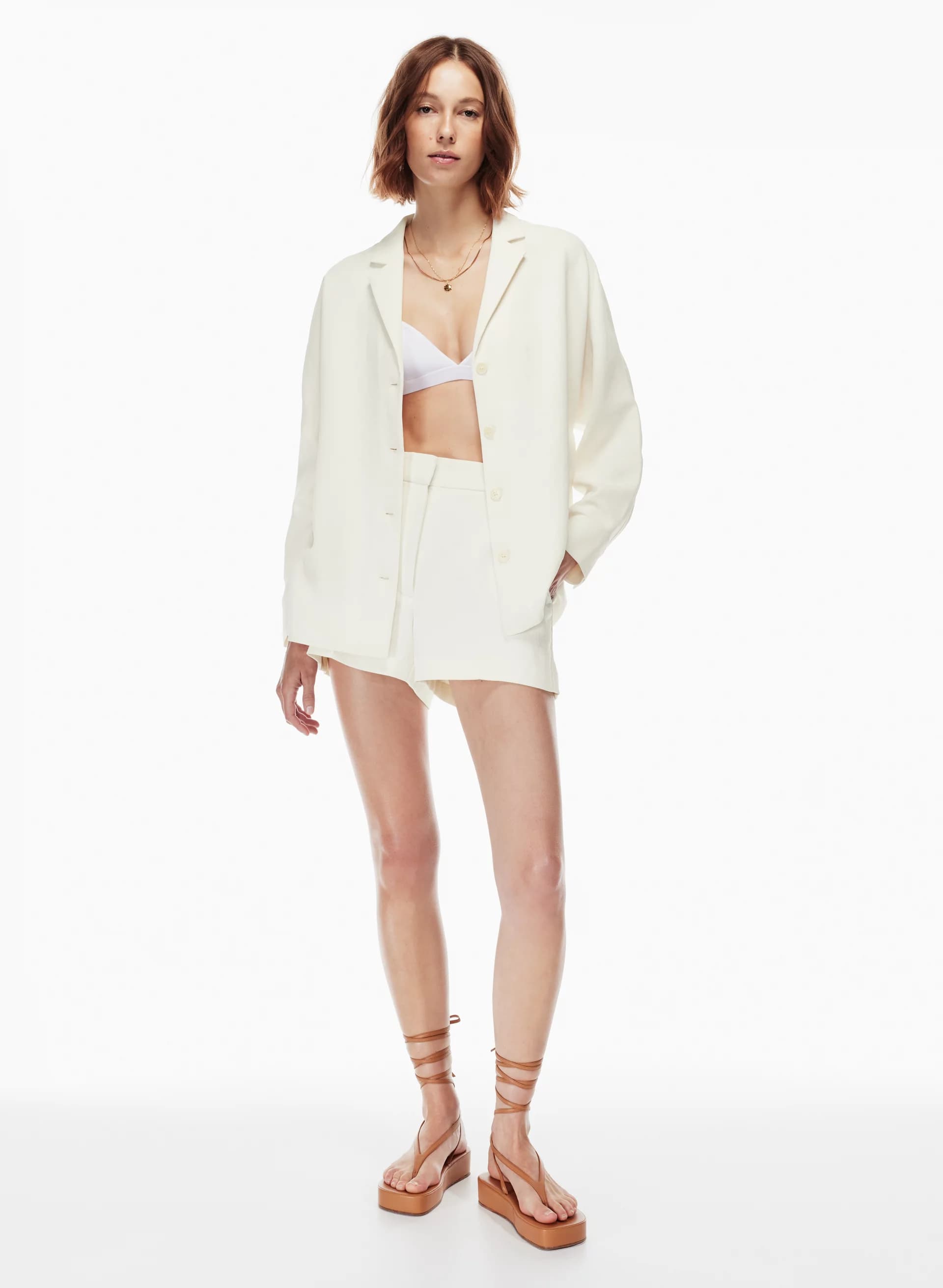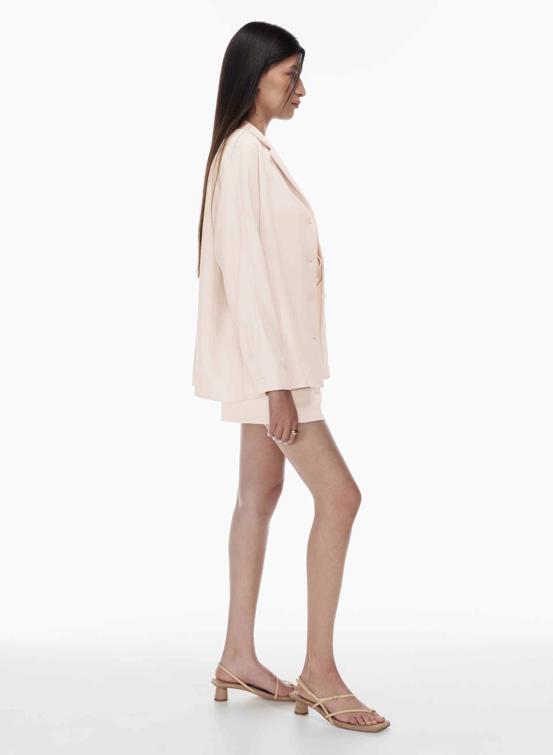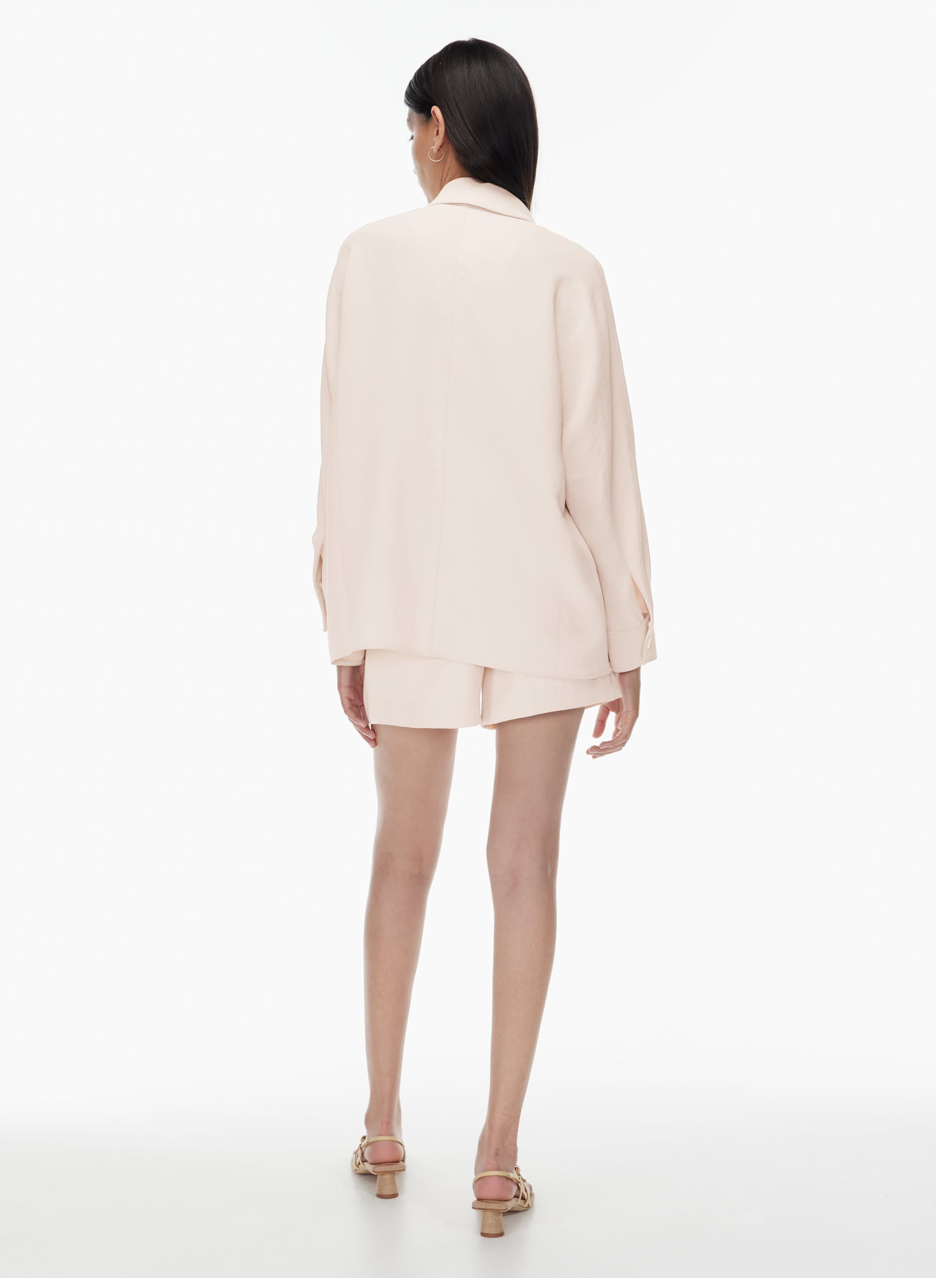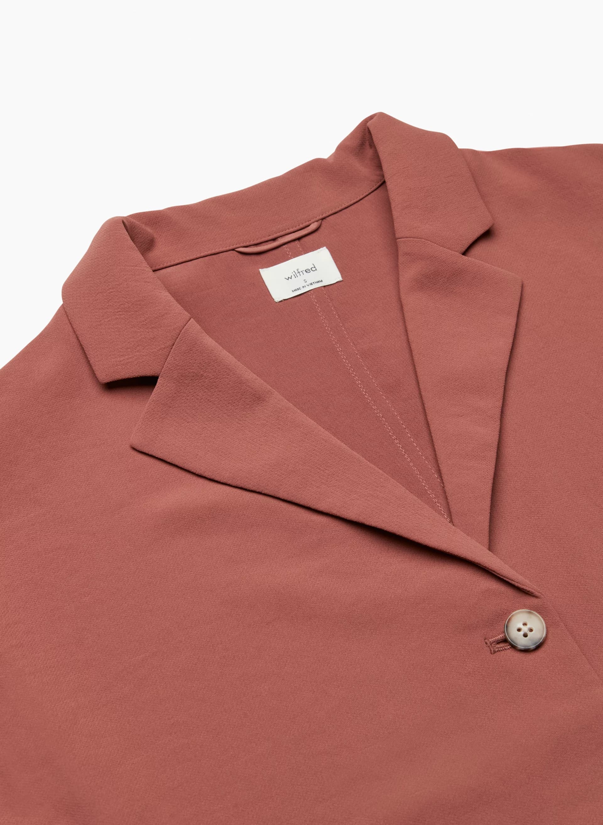 This is a button-up shirt with long dolman sleeves and a notched collar. It’s made from Crepette — a drapey crepe fabric from Japan with a matte finish.