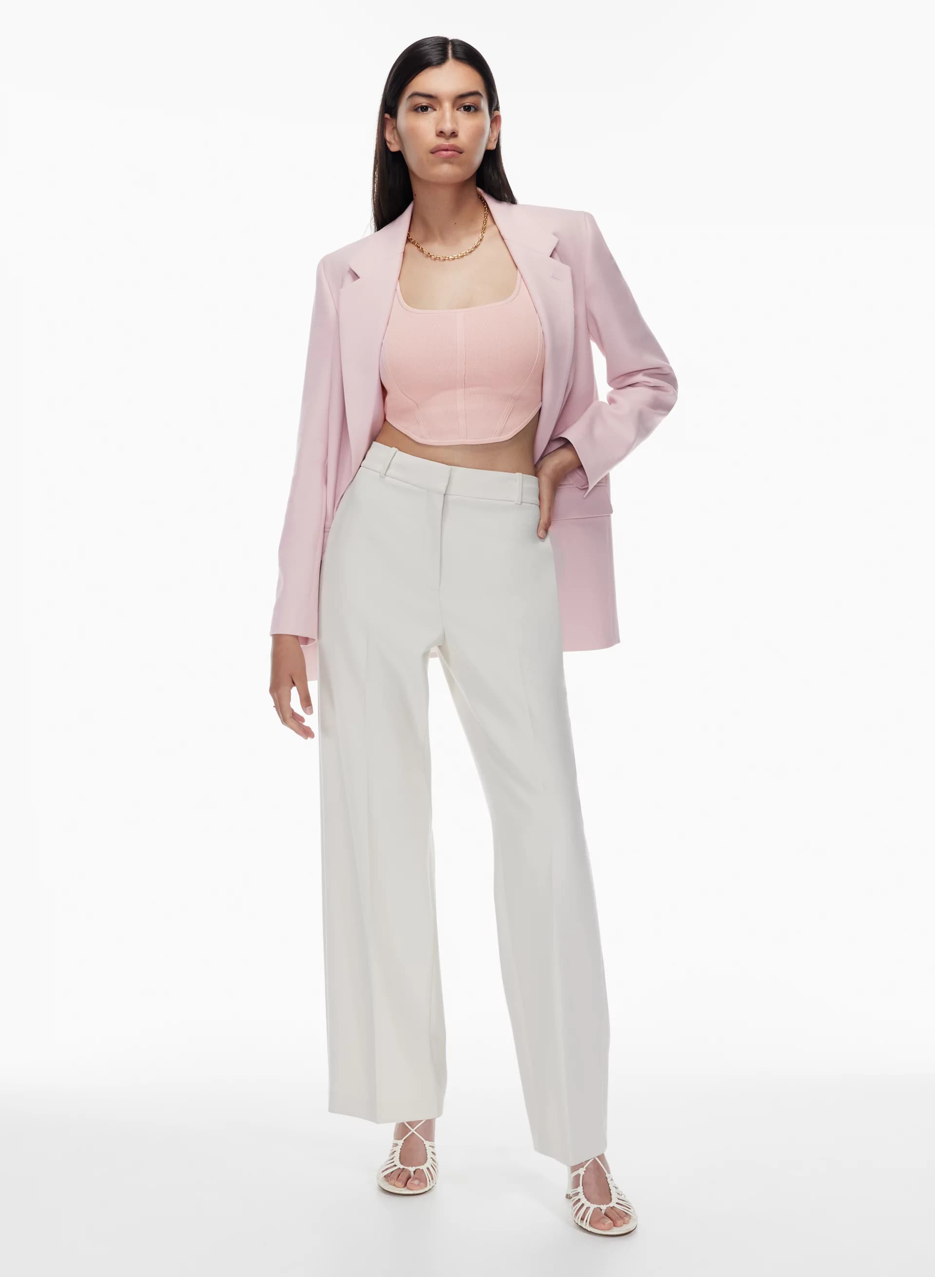 This is a tank top with a double square neckline, bustier-inspired seaming details and fully fashioned construction. Babaton’s signature Sculpt Knit yarn smooths and contours your shape. It’s constructed using a Half Milano stitch for structure and a flat, dense feel.