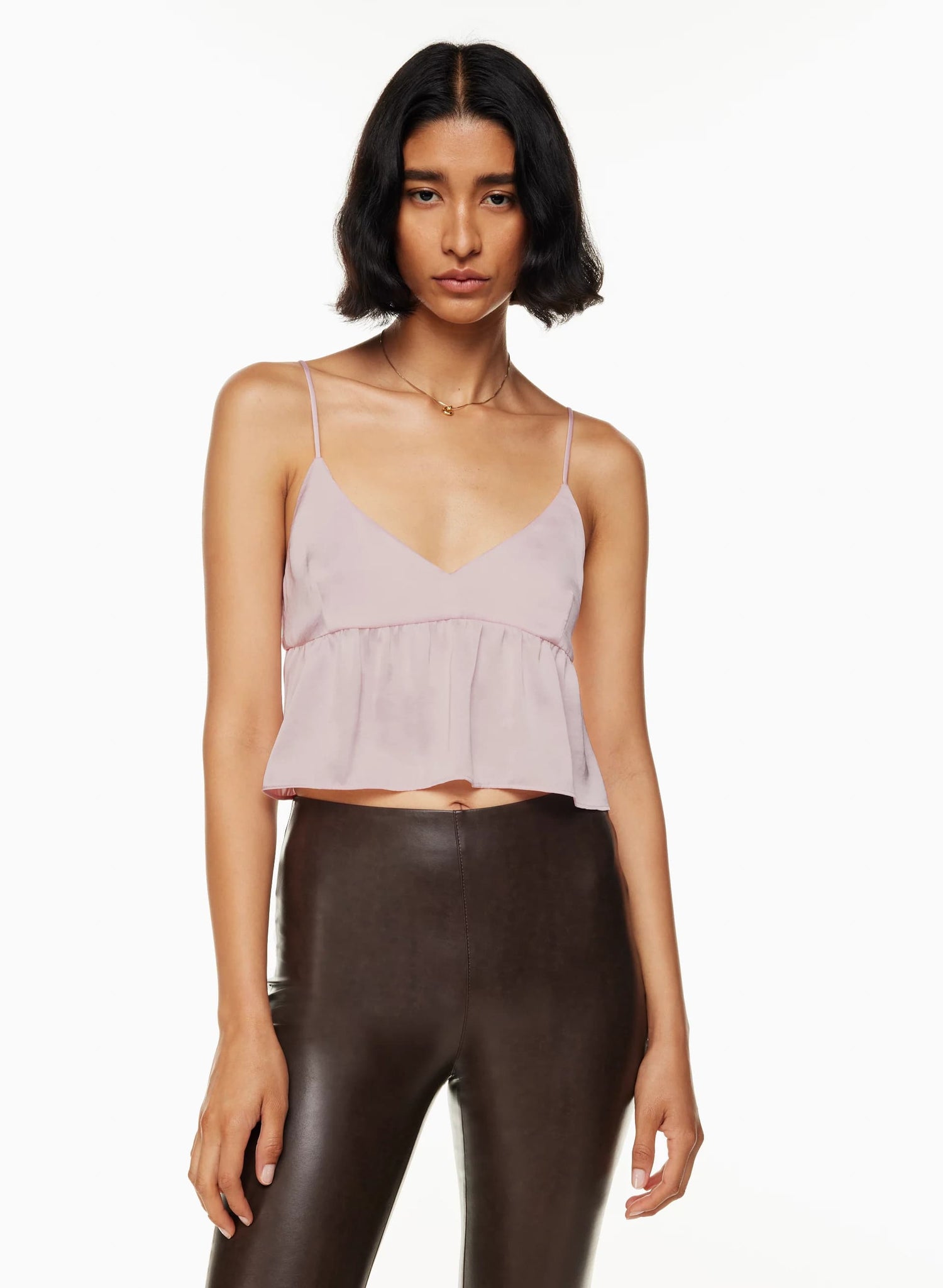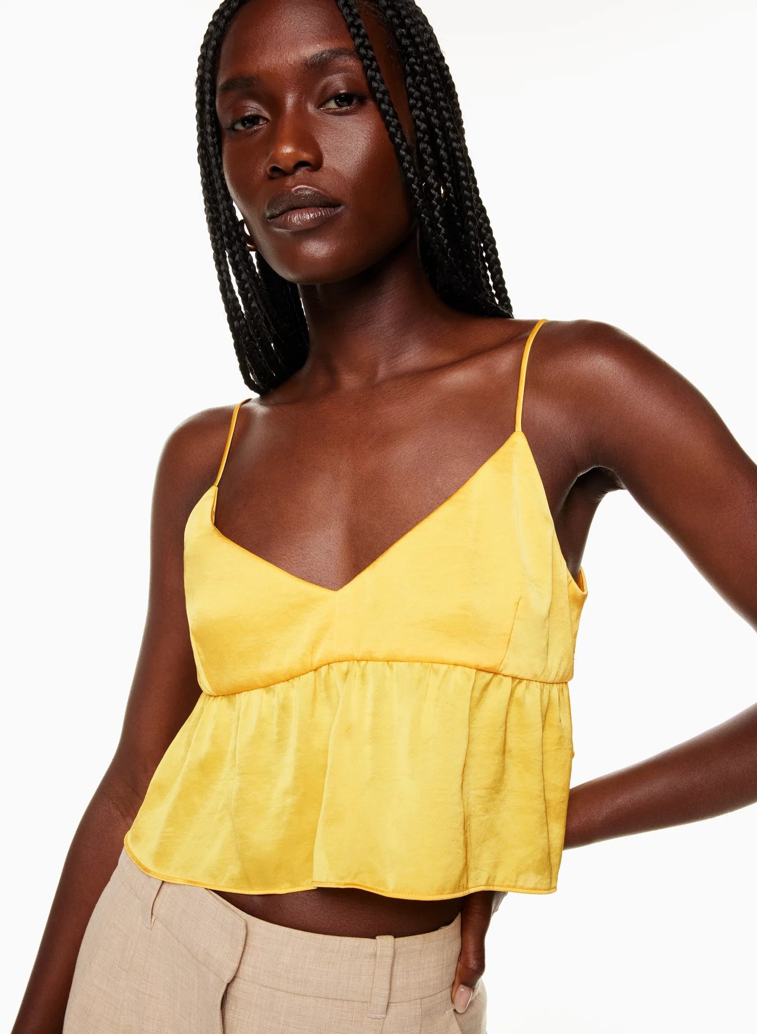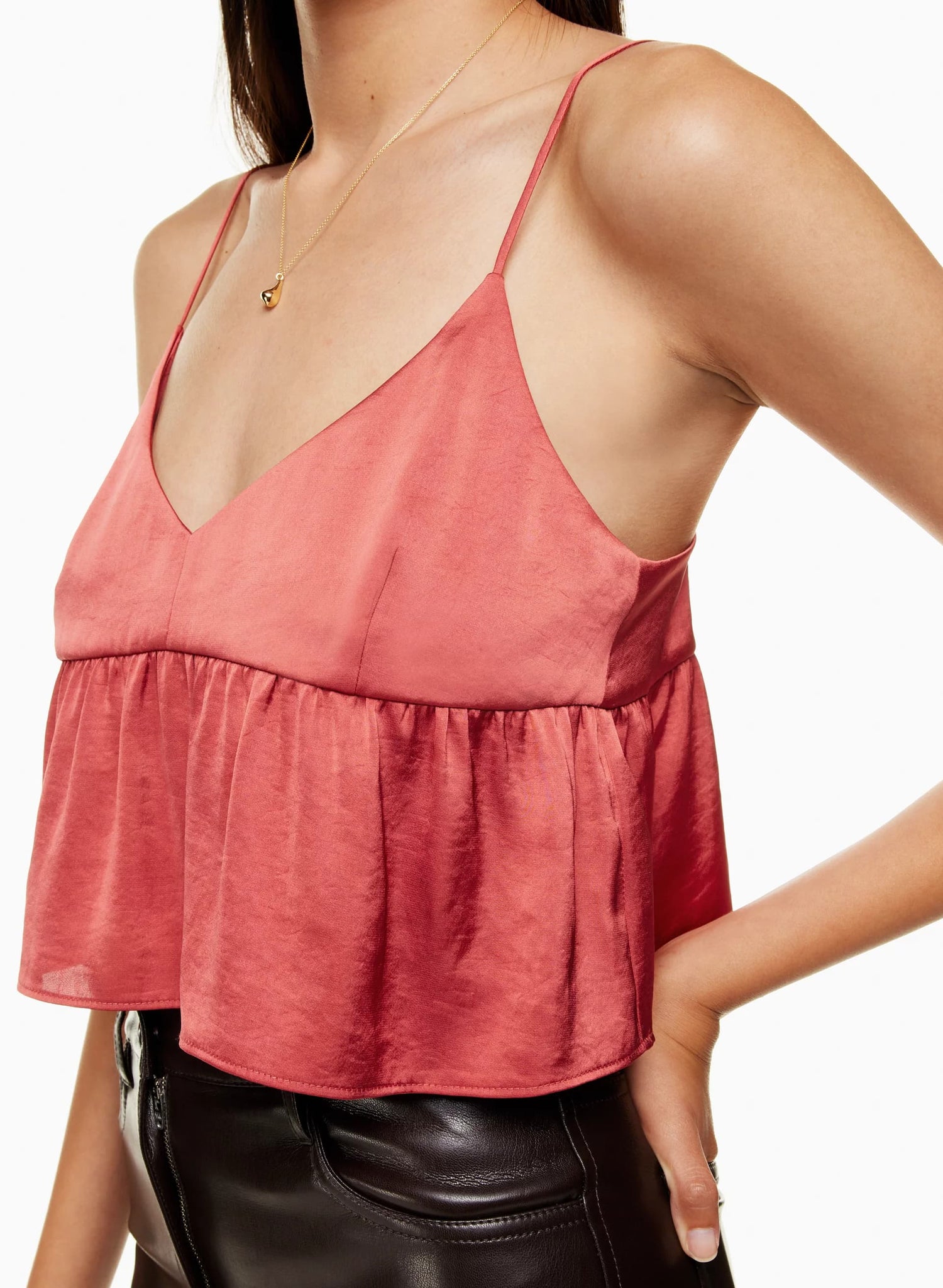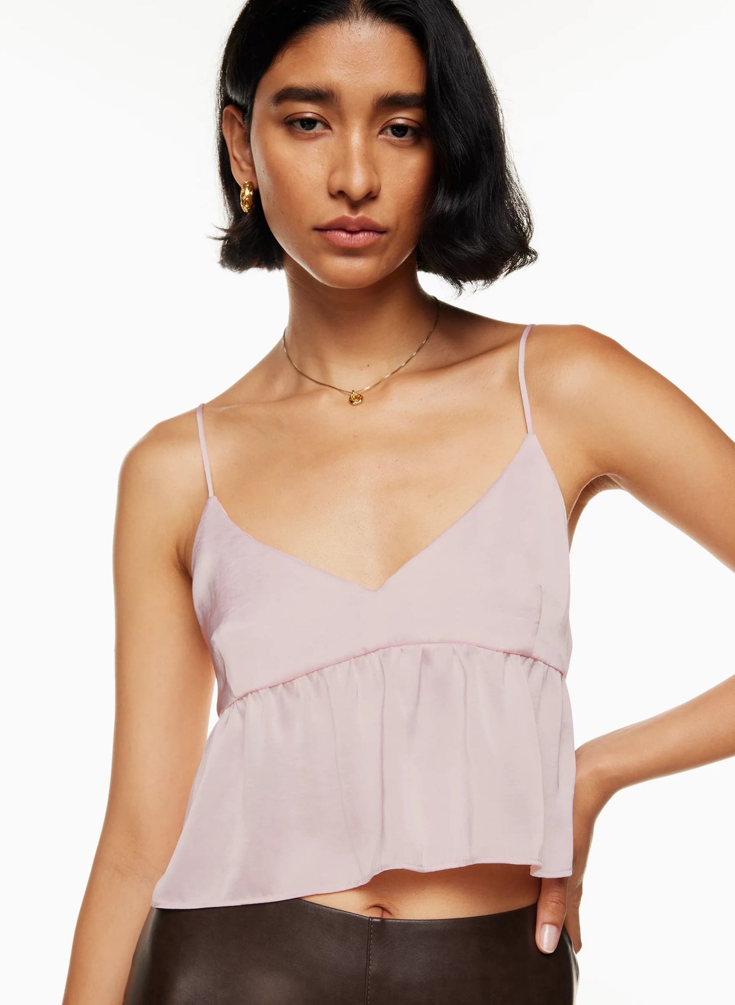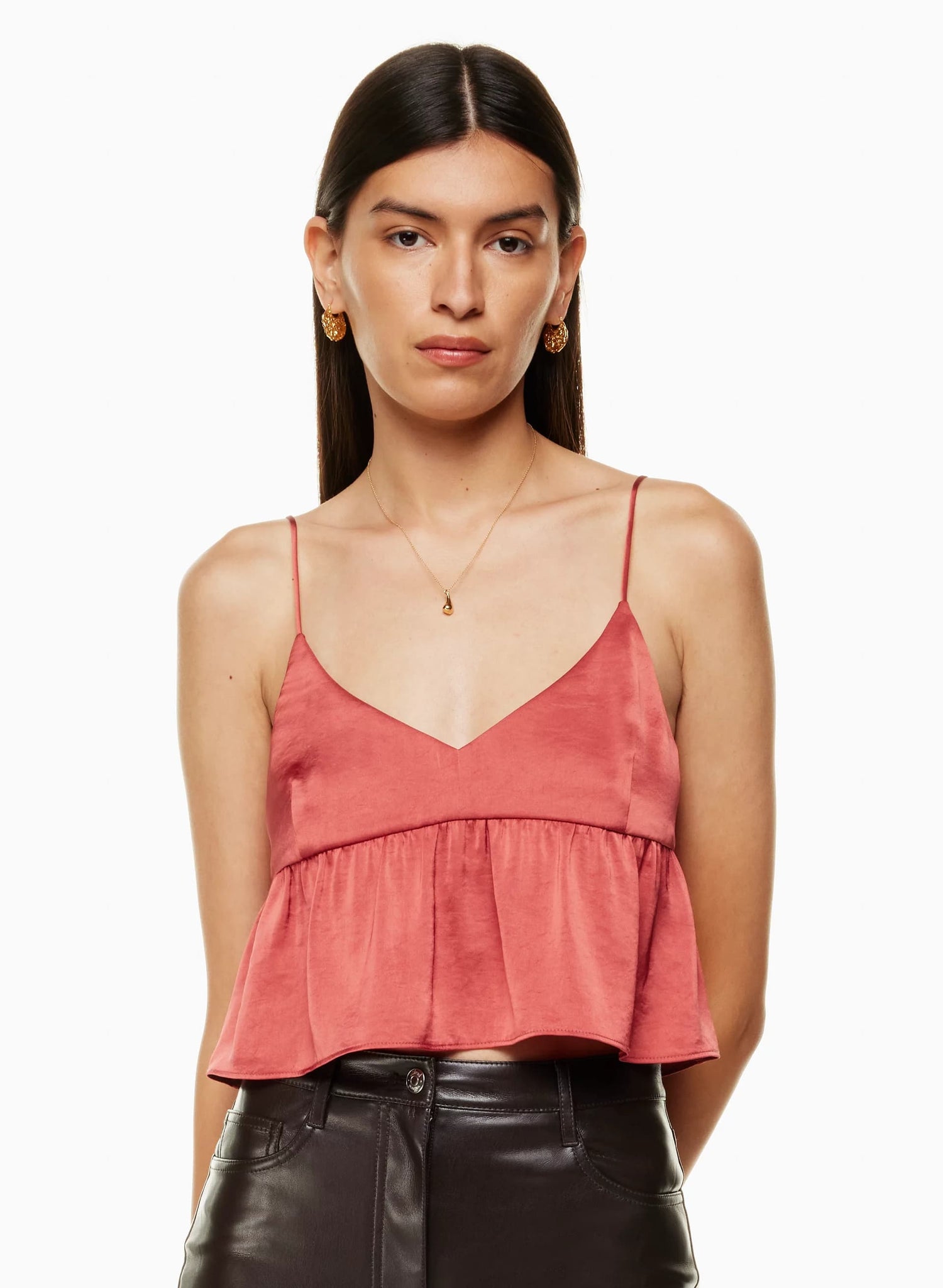 This is a strappy V-neck camisole with a flounced peplum hem and darts for shaping. It’s made from Effortless Satin™ — drapey, lightweight Japanese satin with a glossy look and feel.