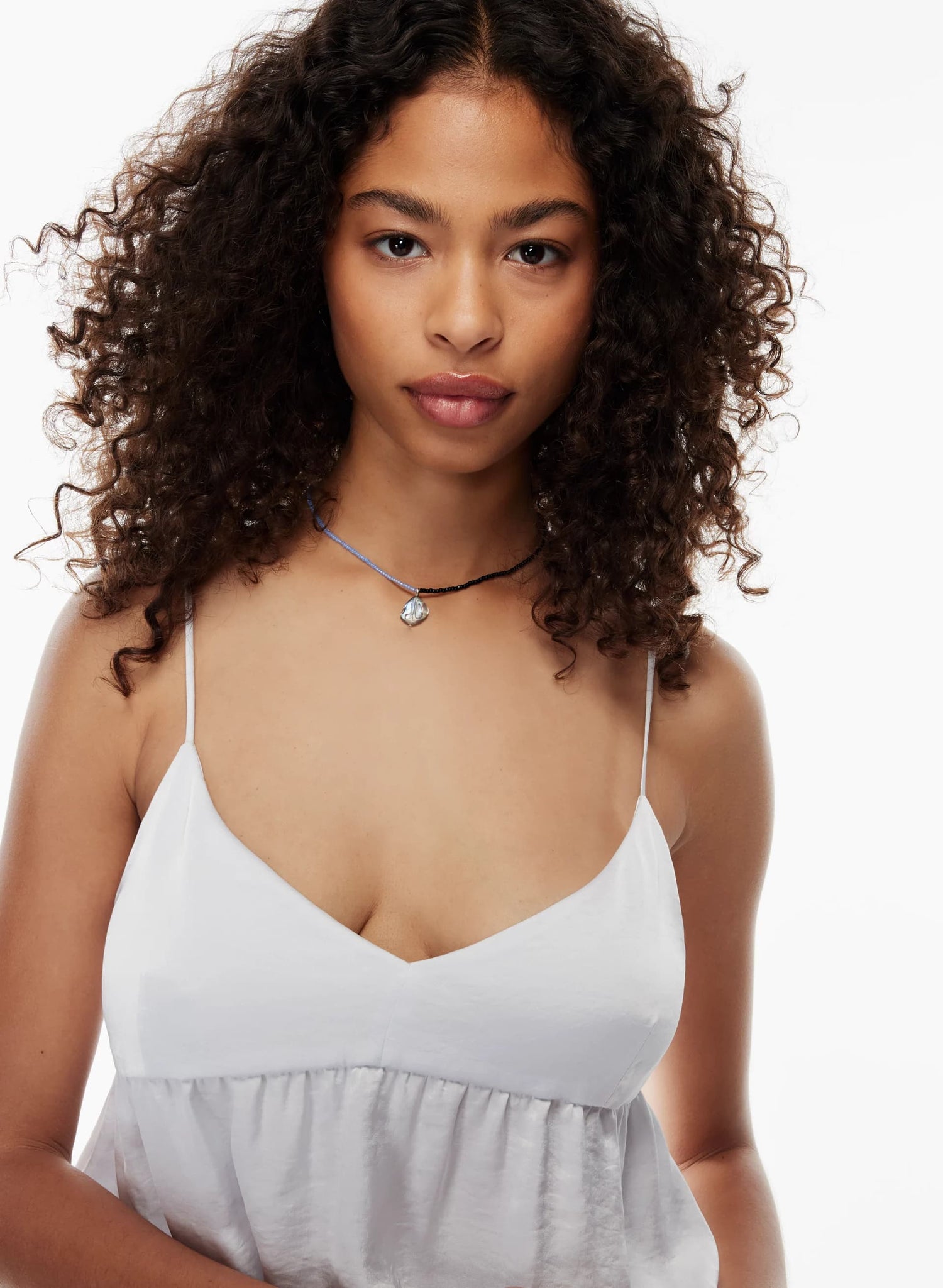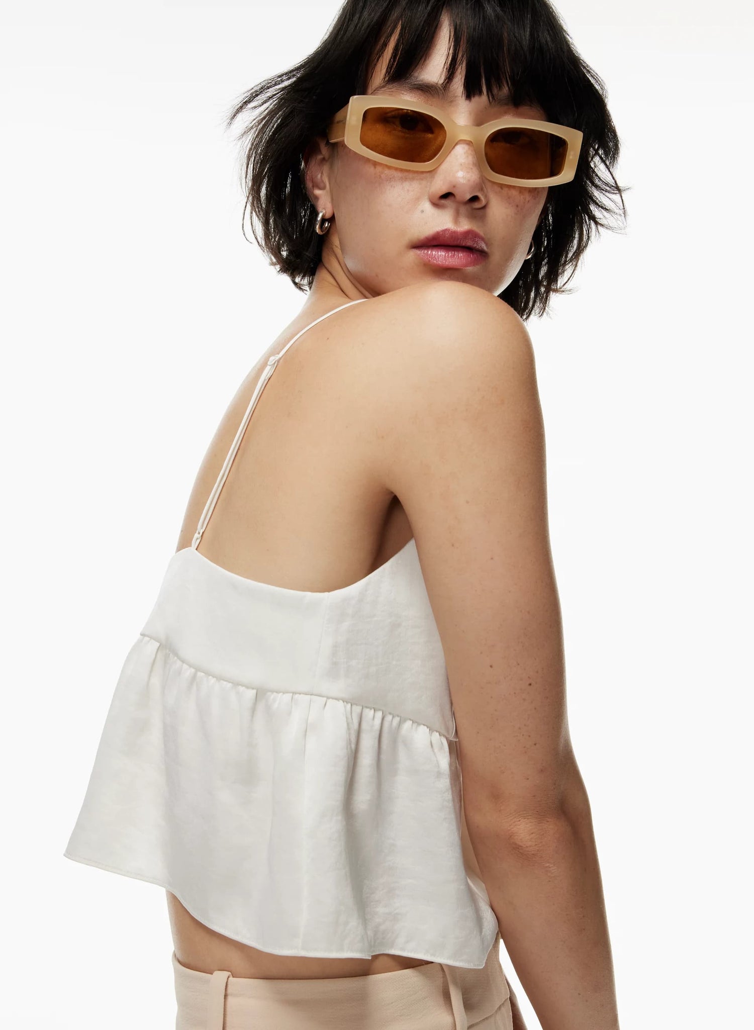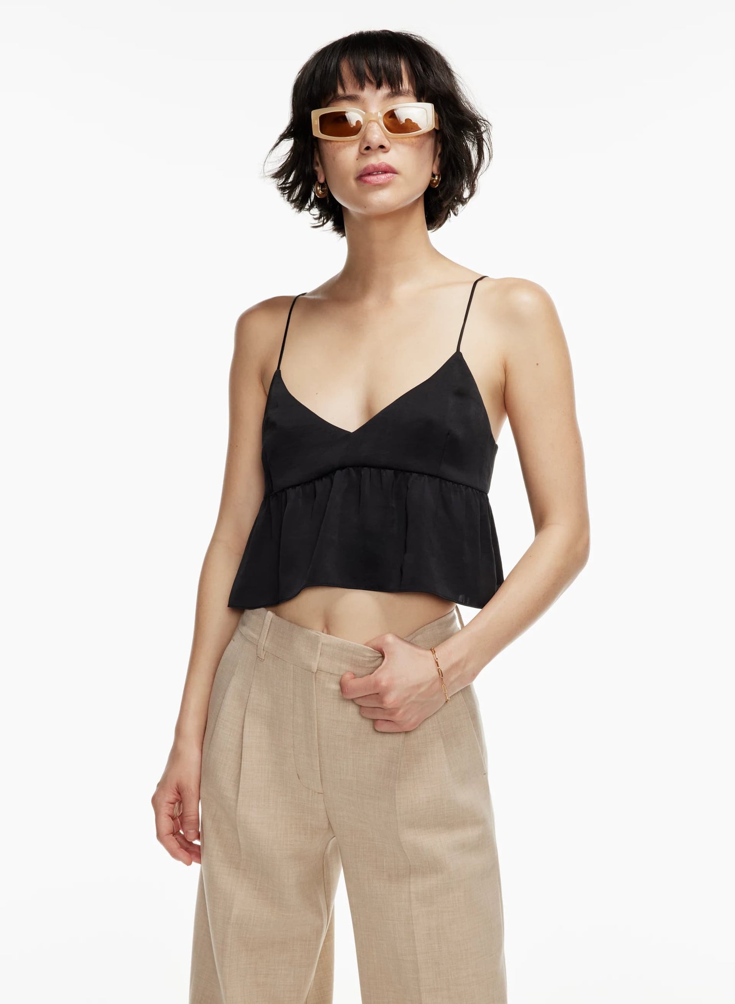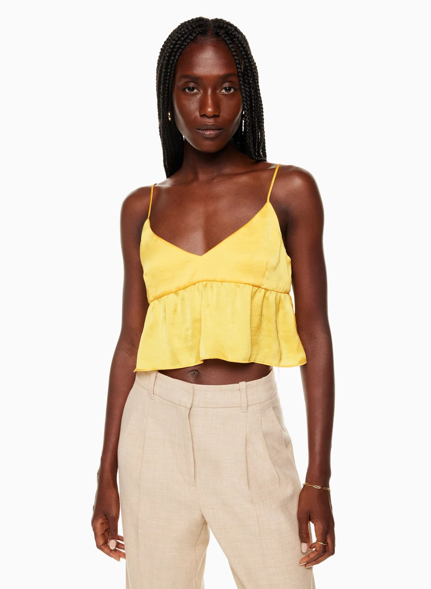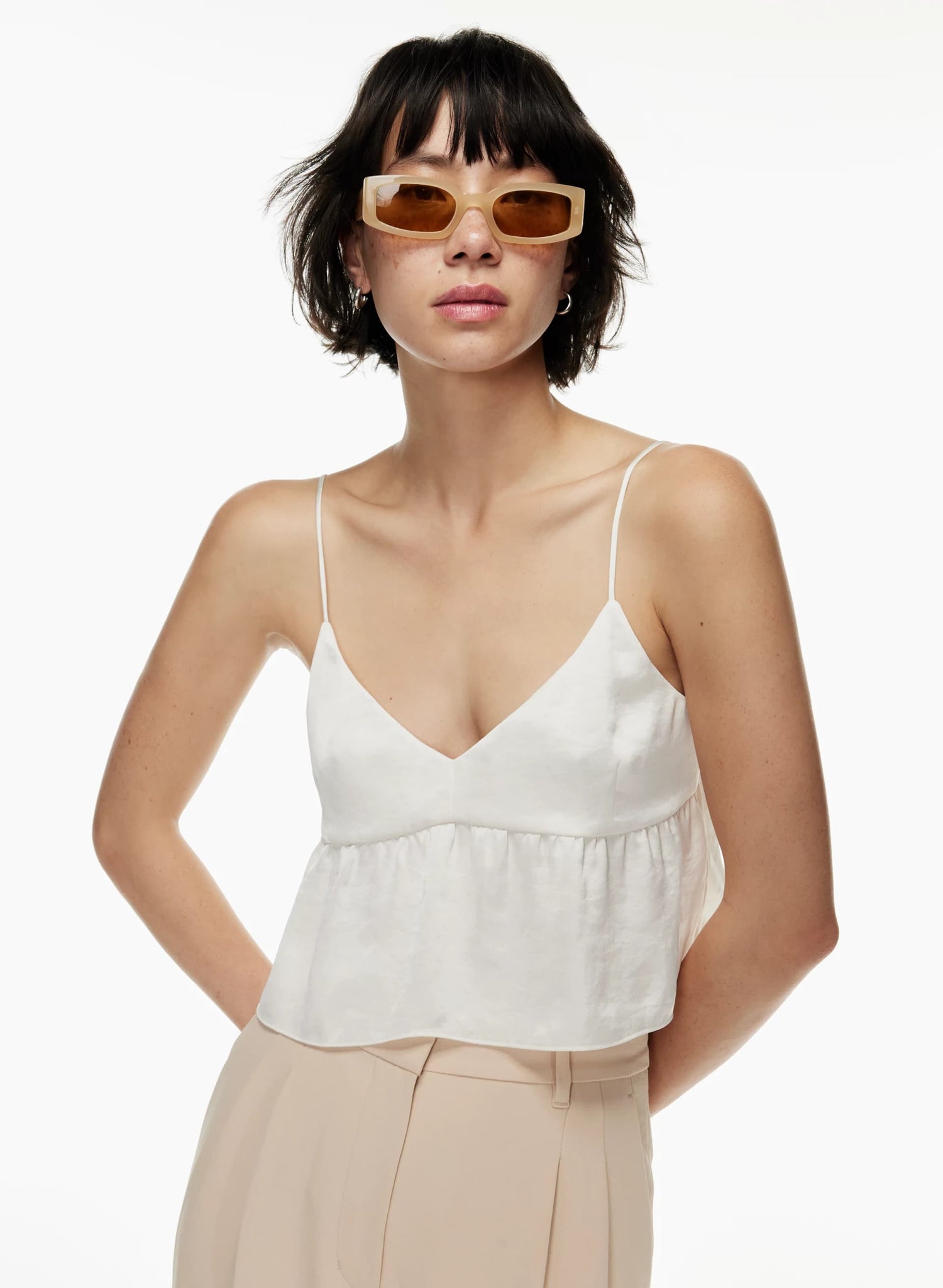 This is a strappy V-neck camisole with a flounced peplum hem and darts for shaping. It’s made from Effortless Satin™ — drapey, lightweight Japanese satin with a glossy look and feel.