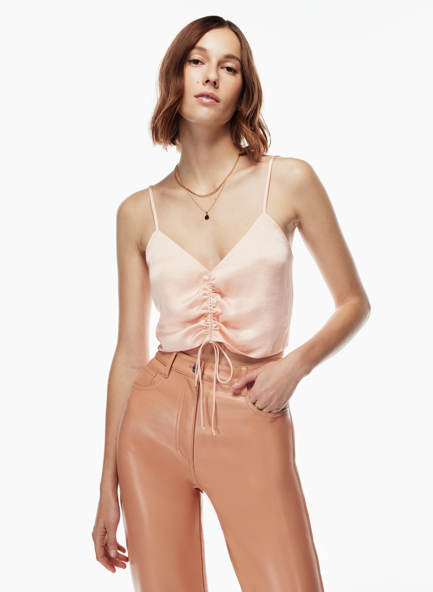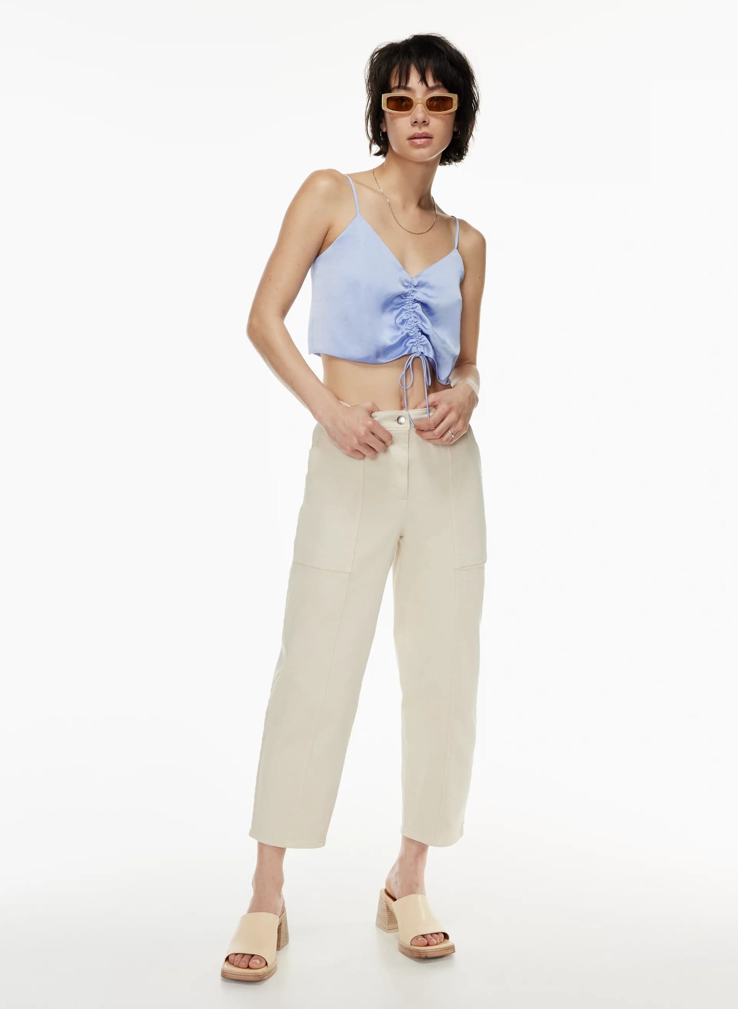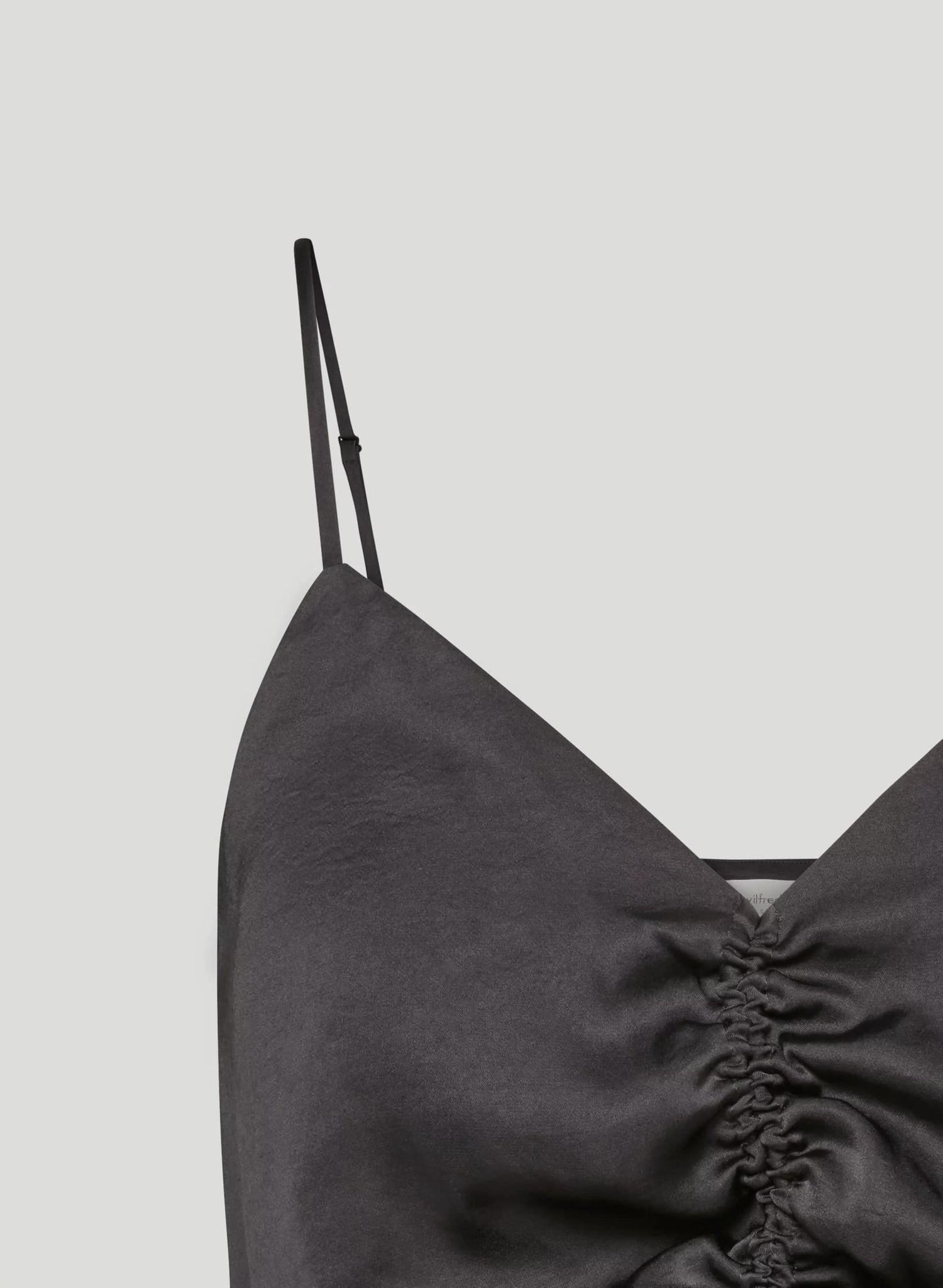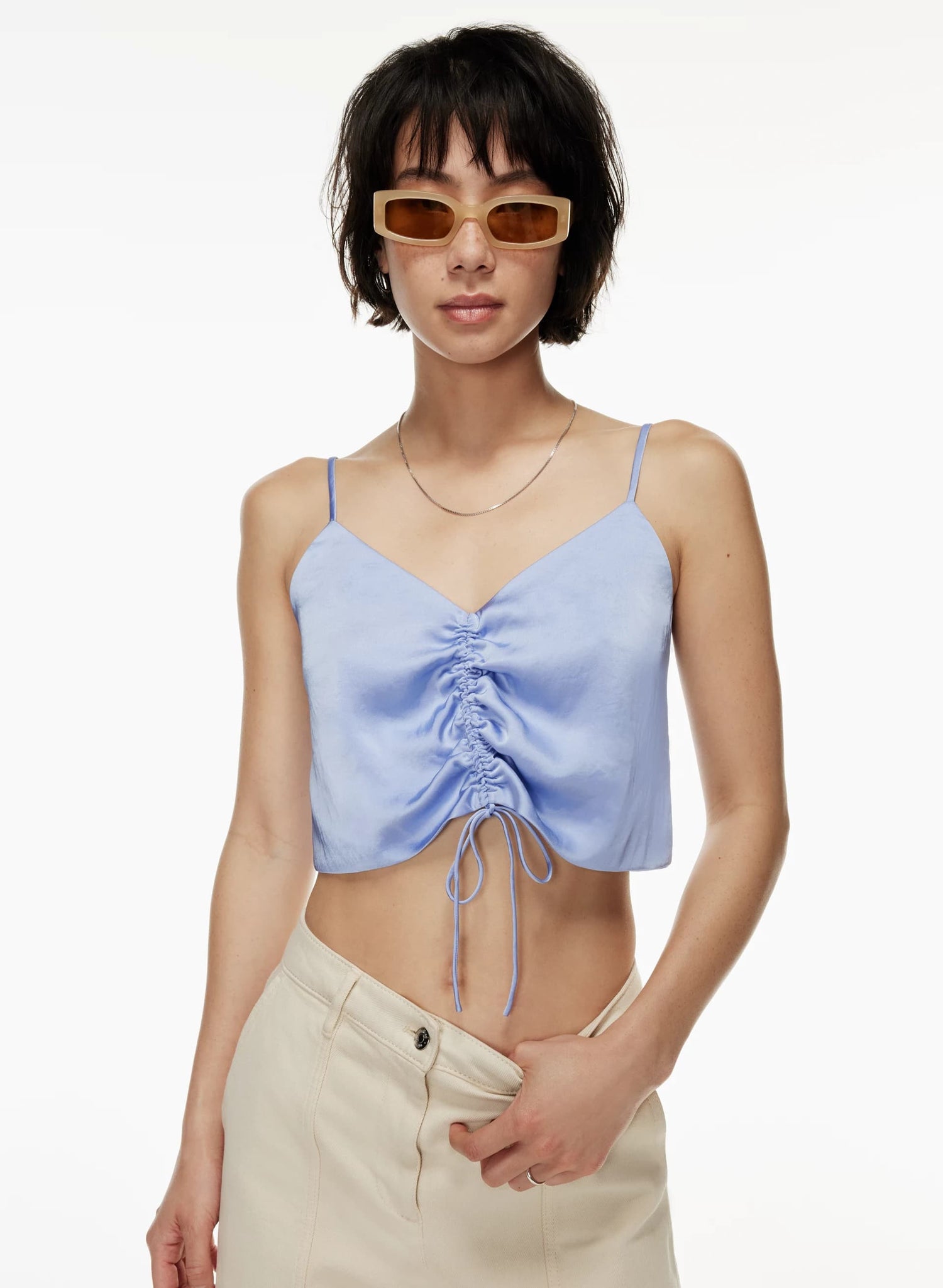 This is a V-neck tank with ruching that can be adjusted with a drawstring. It’s made from Effortless Satin™ — drapey, lightweight Japanese satin with a glossy look and feel.