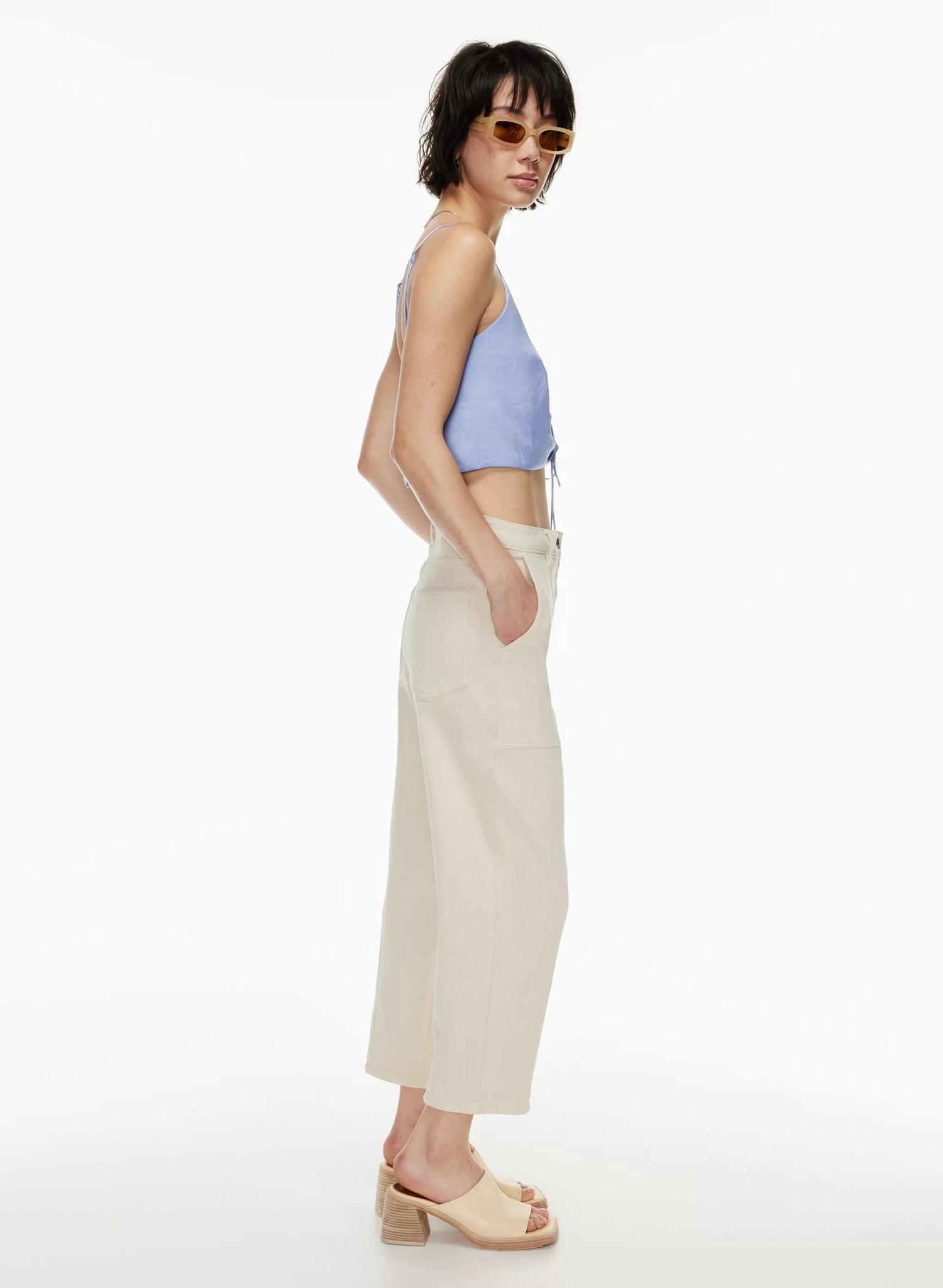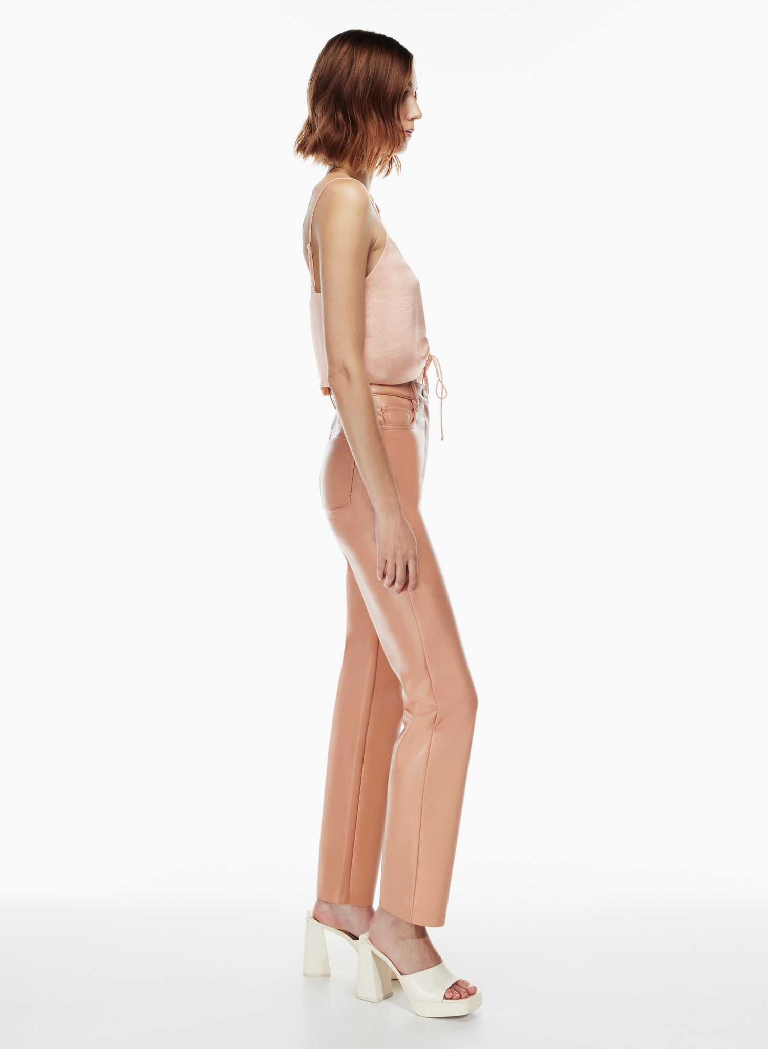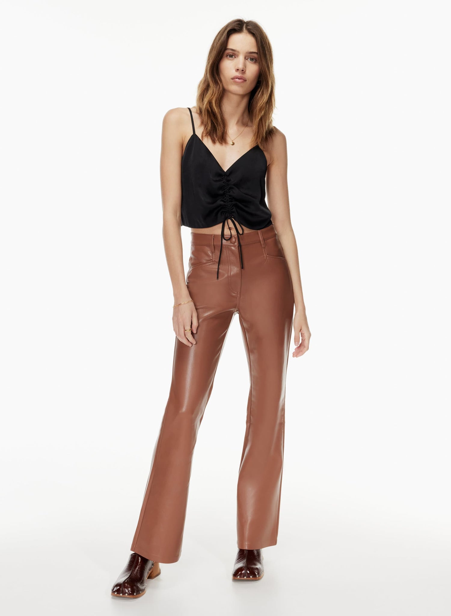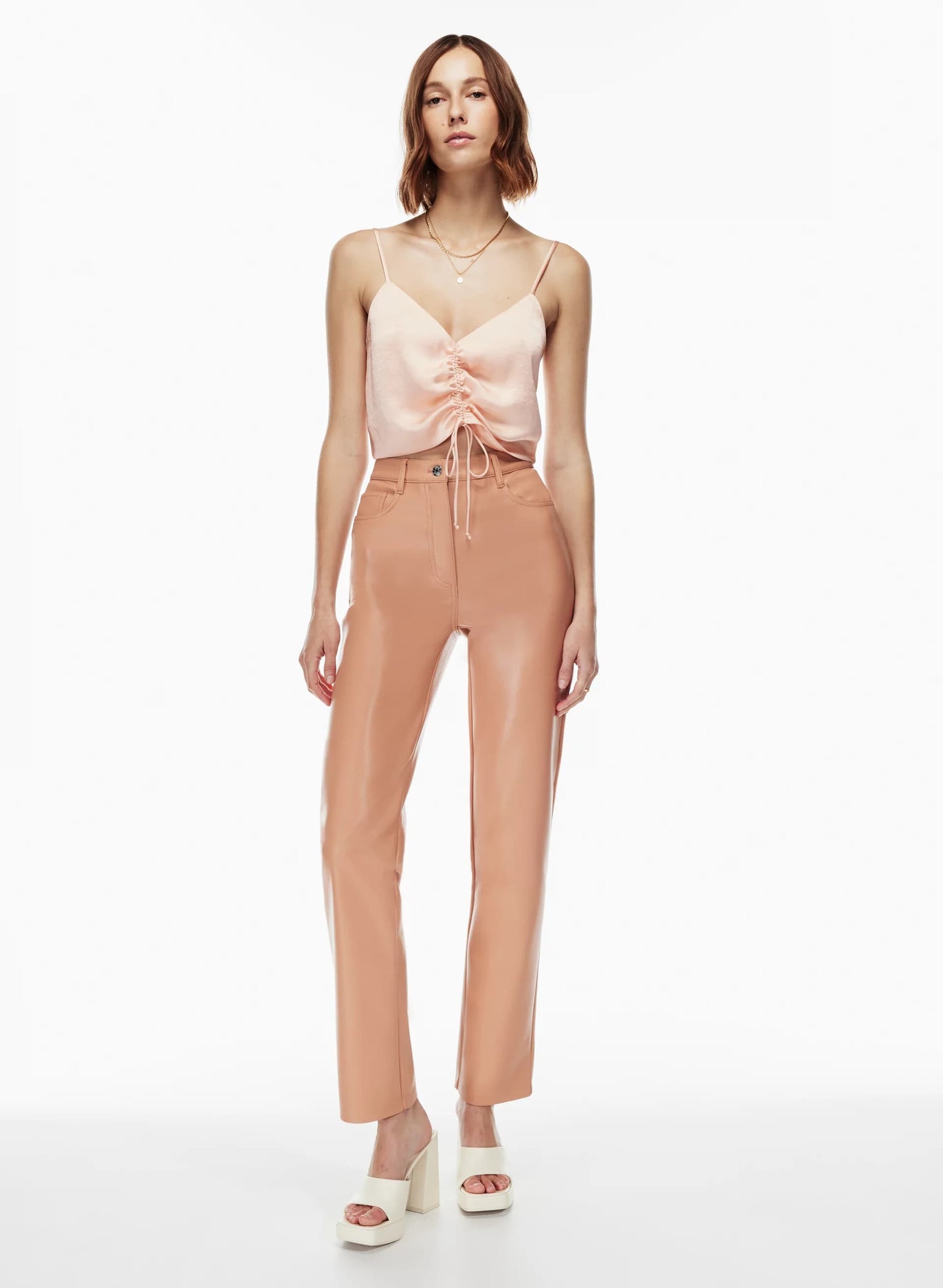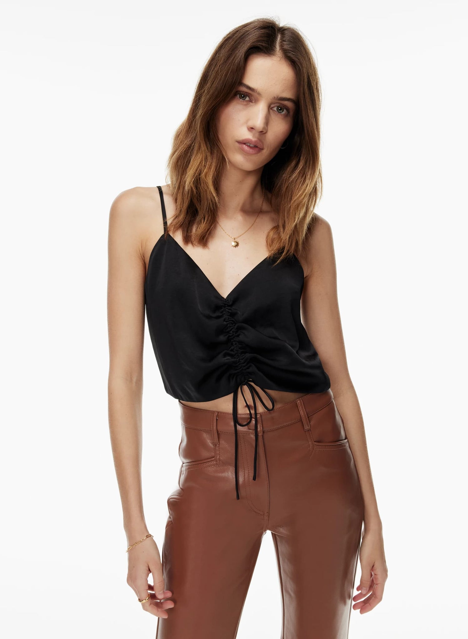 This is a V-neck tank with ruching that can be adjusted with a drawstring. It’s made from Effortless Satin™ — drapey, lightweight Japanese satin with a glossy look and feel.